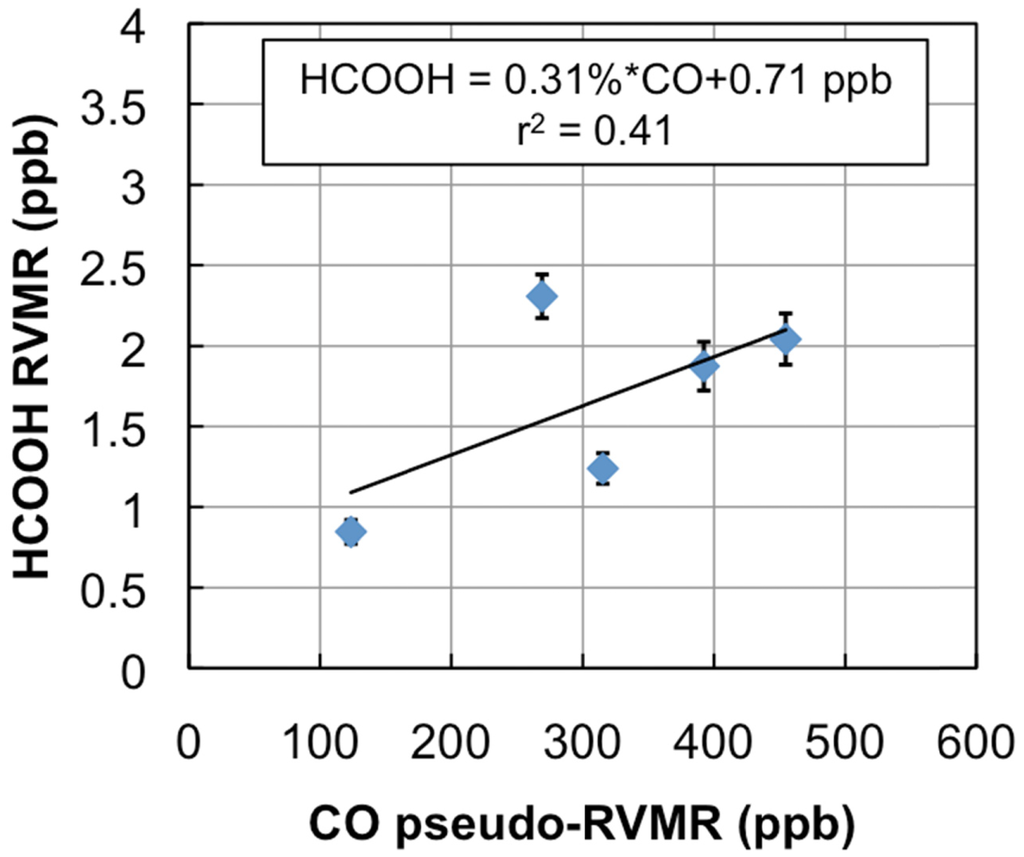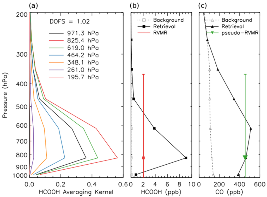 An RVMR for HCOOH and a corresponding CO pseudo-RVMR were calculated following the procedure of Shephard et al. for NH3 [20], as illustrated in Figure 4. The RVMR for HCOOH is lower than the retrieved value at the level of maximum sensitivity to HCOOH, poissibly because the TES sensitivity to HCOOH covers a wide pressure range. The emission ratio of HCOOH was calculated as the slope of the least squares linear regression of the HCOOH RVMR and the CO pseudo-RVMR.