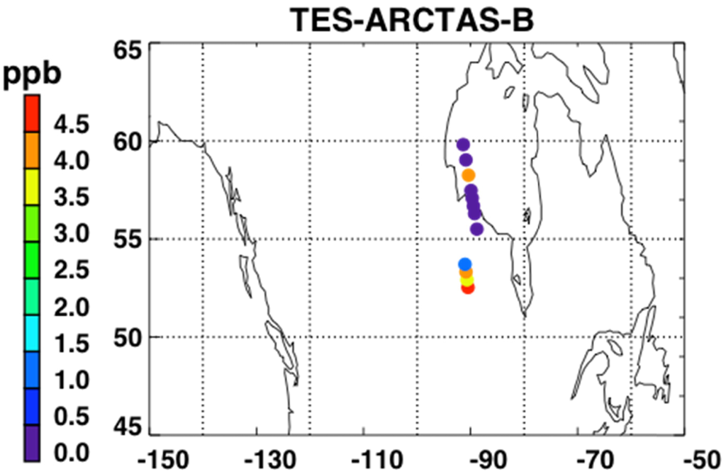 The TES special observations during ARCTAS-B included nadir observations over eastern Siberia, the North Pacific, and North America for every 0.4° latitude. Biomass burning plumes were identified following the procedure in Alvarado et al. [12], which we briefly outline here. We used maps of Level 3 daily AIRS retrievals of CO at 1° × 1° resolution to identify the transport of CO from major regions of boreal biomass burning. We then used TES Level 2 retrievals of CO (V003) to identify the corresponding plumes that were observed by TES. The CO retrievals for TES special observations between 15 June and 15 July 2008 were filtered for data quality as recommended in the TES Level 2 Data Users Guide [48]. In general, the retrievals had 1 DOFS below 250 hPa with the region of maximum sensitivity in the troposphere near 500 hPa. We defined a plume in the TES special observations as an area where the retrieved CO mixing ratio at 510 hPa exceeded 150 ppb. This threshold ensured that the CO retrievals were significantly different from the a priori values (∼110 ppb). While this procedure will detect thick plumes that are transported between continents [49], it does not detect plumes near the surface (where the sensitivity is low) or very thin or dilute plumes. We then used HYSPLIT back-trajectories [50] to determine if the observed air masses came from boreal biomass burning regions in Siberia (17 plumes) and Canada (5 plumes). The CO and O3 retrievals for these plumes were analyzed by Alvarado et al. [12]. In this paper, we restrict our analysis to the fresh plumes from Canadian biomass burning.