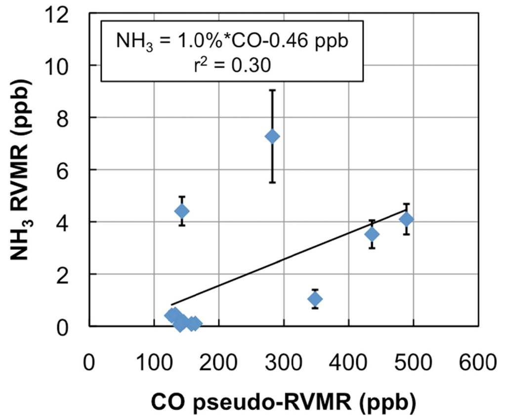 Figure 6 shows the NH3 RVMR versus the CO pseudo-RVMR for all of the retrievals shown on the map in Figure 5. The most elevated amounts of CO and NH3 come from a fresh smoke plume from a single Canadian fire observed by TES between 52.5–54.1°N and 90.5–91.8°W at 19:03 UTC on 1 July 2008 (TES Run #7656). Due to the high retrieved values for CO (>500 ppb), this plume likely contains concentrated fresh smoke. Also included are retrievals of NH3 within a more dilute smoke plume observed between 55.5–59.8°N and 88.8–91.4°W at 18:51 UTC on 17 June 2008 (TES Run #7472).