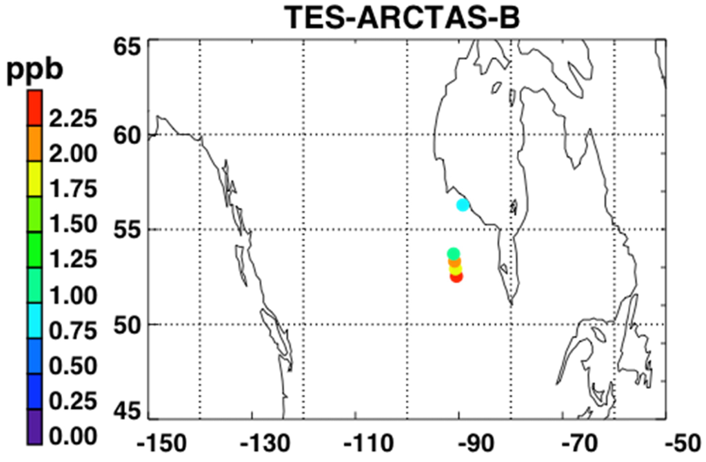 Ethylene (C2H4) is a reactive hydrocarbon that is emitted directly by biomass burning [3]. It has a short lifetime in the summer Arctic troposphere (14–35 h, [12]) due to rapid reaction with OH. As this rapid oxidation of ethylene impacts the ozone formation rate within young smoke plumes [40], better estimates of the emissions of ethylene from biomass burning could help to reduce the uncertainty in the impact of biomass burning on tropospheric ozone. Enhanced mixing ratios of ethylene were measured in TES prototype airborne measurements of western wildfires [18], and C2H4 has also been previously identified by ACE-FTS [39] and IASI [9,10], but it had not been previously detected in TES spectra.
