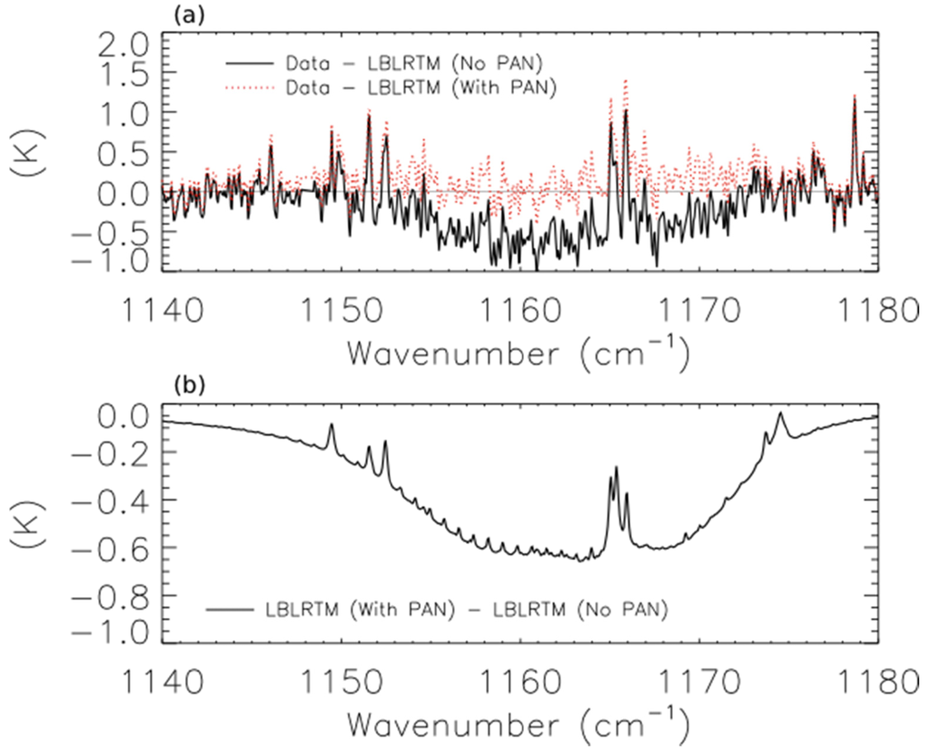 The two lobes of PAN absorption are clearly visible on either side of the water line at ∼1165 cm−1. The dotted red line shows the residuals when a hypothetical PAN profile with a peak concentration of 1.9 ppb at 560 hPa is added to the forward model, and Figure 9b shows the modeled PAN spectrum as a solid black line. Adding the PAN profile substantially reduces the mean residuals, but this peak concentration of PAN in the assumed profile is about a factor of 2 higher than the concentration of PAN observed 30–60 min downwind of the Lake McKay fire in Saskatchewan, Canada during ARCTAS-B [12]. We have also detected PAN in a scan of aged smoke from Siberian biomass burning observed near Kamchatka (not shown). These two scans shared several common features, including relatively high mixing ratios of CO (mixing ratio > 250 ppbv at 510 hPa) and low average cloud optical depth (<0.1). This low cloud optical depth may be a necessary but insufficient criterion for detecting PAN in biomass burning smoke plumes with TES.