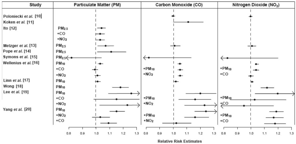 To date, only a few multicity studies of hospital admissions and ED visits for IHD/MI or CHF have included analyses of multiple pollutants, in contrast to the single-city analysis results described here. Bell et al. [37] report a significant single pollutant effect of CO with all cardiovascular disease (CVD) admissions and reported that the effect was robust to adjustment for PM2.5, NO2 and elemental carbon (EC). In a separate report, these authors found a significant effect for PM2.5 in a single-pollutant model [40]. These investigators have also analyzed PM2.5 components and size fractions, attempting to distinguish their independent effects through the use of multipollutant models [41–43]. A report from the United Kingdom Department of Health [44] presented pooled estimates for cardiovascular hospital admissions including IHD and CHF. Authors reported that both heterogeneity in the size of the effect estimates and publication bias were detected. Few studies have evaluated the sources of heterogeneity in risk estimates across single city studies of hospital admission and ED visits for cardiovascular diseases. One previous multicity analysis conducted in Europe reported that 84% of the heterogeneity in the PM10 estimates across the cities examined could be explained by the PM10-NO2 correlation. The PM10-NO2 correlation explained a much smaller proportion (i.e., <4%) of the between estimate variation in these analyses.