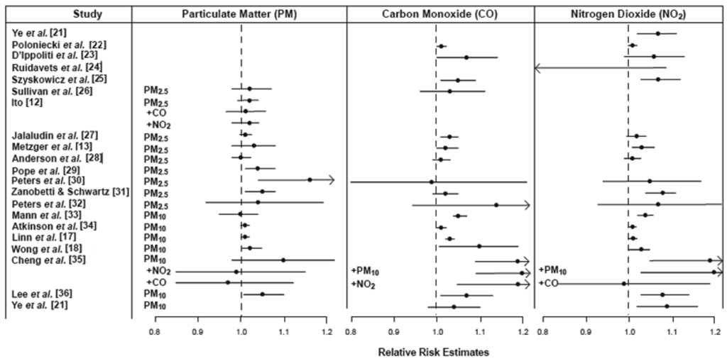 Although the science needed to inform our understanding of the health effects of air pollution mixtures is not adequately developed at present [4], the current body of evidence on single pollutant effects can be leveraged to characterize the state of knowledge regarding the independent and the combined effects of exposure to multiple pollutants. The objective of this analysis was to consider the evidence on single pollutant associations of PM, CO and NO2 with cardiovascular hospitalizations reported across a range studies. We applied meta-regression methods to understand the differences in the size of the observed effect estimates across studies. We hypothesized that several factors including those related to characteristics of the study design, pollution mixture and monitoring network would explain some of heterogeneity observed.