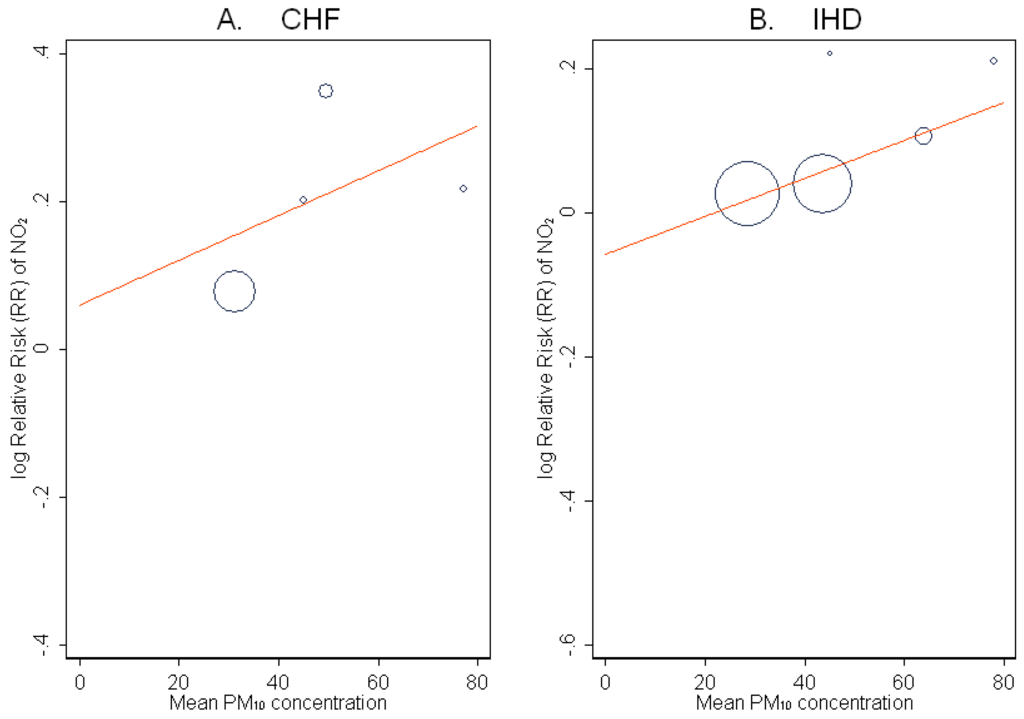 The integration of findings across scientific disciplines in the ISA supported the independent effects of PM and CO exposure on IHD and CHF [5,6]. Associations between short term NO2 exposure and cardiovascular hospitalizations were also consistently observed [45].The simultaneous consideration of these highly correlated individual pollutants represents an initial step in assessing the health effects of multiple pollutants in the absence of a large number of studies designed specifically to evaluate the effects of complex pollutant mixtures. In this paper, we present preliminary results suggesting that study methodology, concentrations of other pollutants, and monitor density may influence the observed effect estimates in single-city studies of air pollution and cardiovascular hospitalizations or ED visits. Our results may be useful in the design of future studies or aid in interpreting health effects in a multipollutant context. For example, the suggestion that NO2 effect estimates are higher when PM10 concentrations are also elevated may suggest a joint effect of these pollutants, or that PM is an indicator for poor air quality in general. However, our analyses were limited because findings for various pollutants, lags and averaging times examined were not reported consistently across studies, nor were the mean levels of co-pollutants and correlations between pollutants. Efforts by investigators to report results for the complete set of associations examined would maximize the utility of single city studies of air pollution for these types of meta-regression analyses.