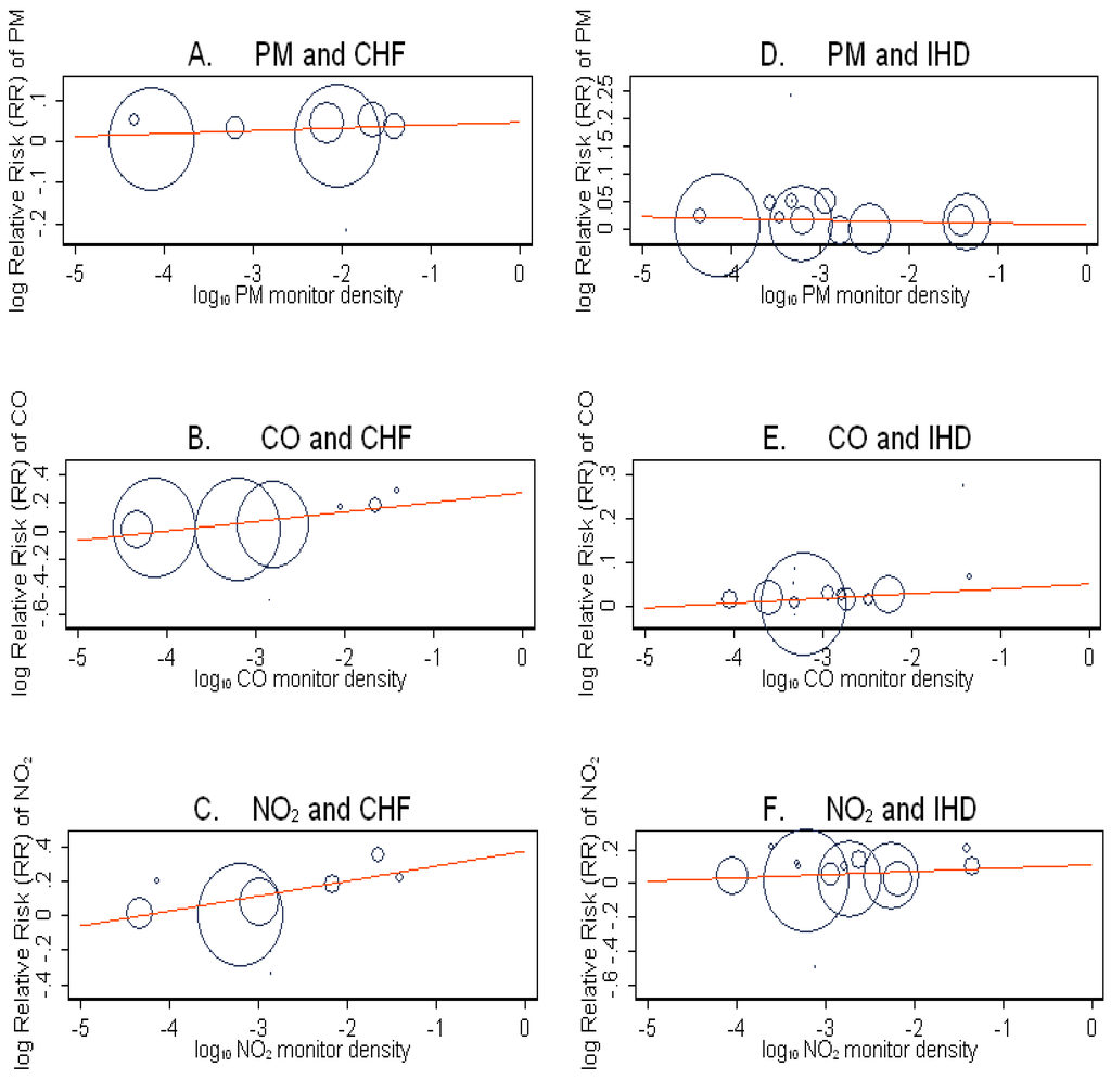 The univariate relationship between the log RR and several continuous variables including, mean concentrations, correlations between pollutants and monitor density, was also determined and plotted. Monitor density was defined as the log of the number of monitors divided by the area of the study as reported by the investigators or as estimated independently using Geographic Information Systems (GIS) methods. The size of the circle on the plots of these univariate relationships is proportional to the inverse of the variance of the log RR. The lines represent the inverse variance weighted regression equations. Larger circles indicate larger studies that are given more weight in the meta-regression analysis.
