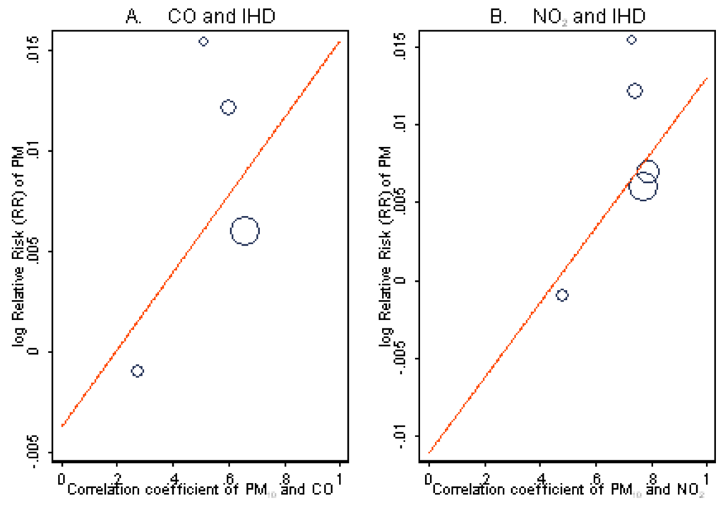 Despite these limitations, effect size modeling confirmed that some variation in the log RR between studies was due to study design, choice of lag and other methodological differences across studies. We observed that the log RR for NO2 associations increased with PM10 concentration and the log RR for PM associations increased with the correlation of PM10 and NO2. We also found that the size of the risk estimate for CVD hospitalizations increased with increasing monitor density. Enhanced spatial coverage of the monitors is expected to reduce the potential for exposure error and consequently reduce attenuation of the risk estimates. A similar result suggesting increased effect estimates for CVD hospitalizations was observed by Bell et al. [37], who found that an IQR increase in monitor density corresponded to an 8% and 20% increase in the association with CO and NO2, respectively. Sarnat et al. [38] did not find that effect estimates varied across different monitors in an urban area, although they were attenuated for CO and NO2 (but not PM2.5) when a rural monitor located 60 km away was used for the analysis. This finding may be due to the somewhat greater variability for CO and NO2 relative to PM2.5. This is also supported by a simulation study showing a smaller impact of measurement error on effect estimates for pollutants with less spatial heterogeneity [39]. Further, these findings may also be due to chance since a large number of relationships were explored.
