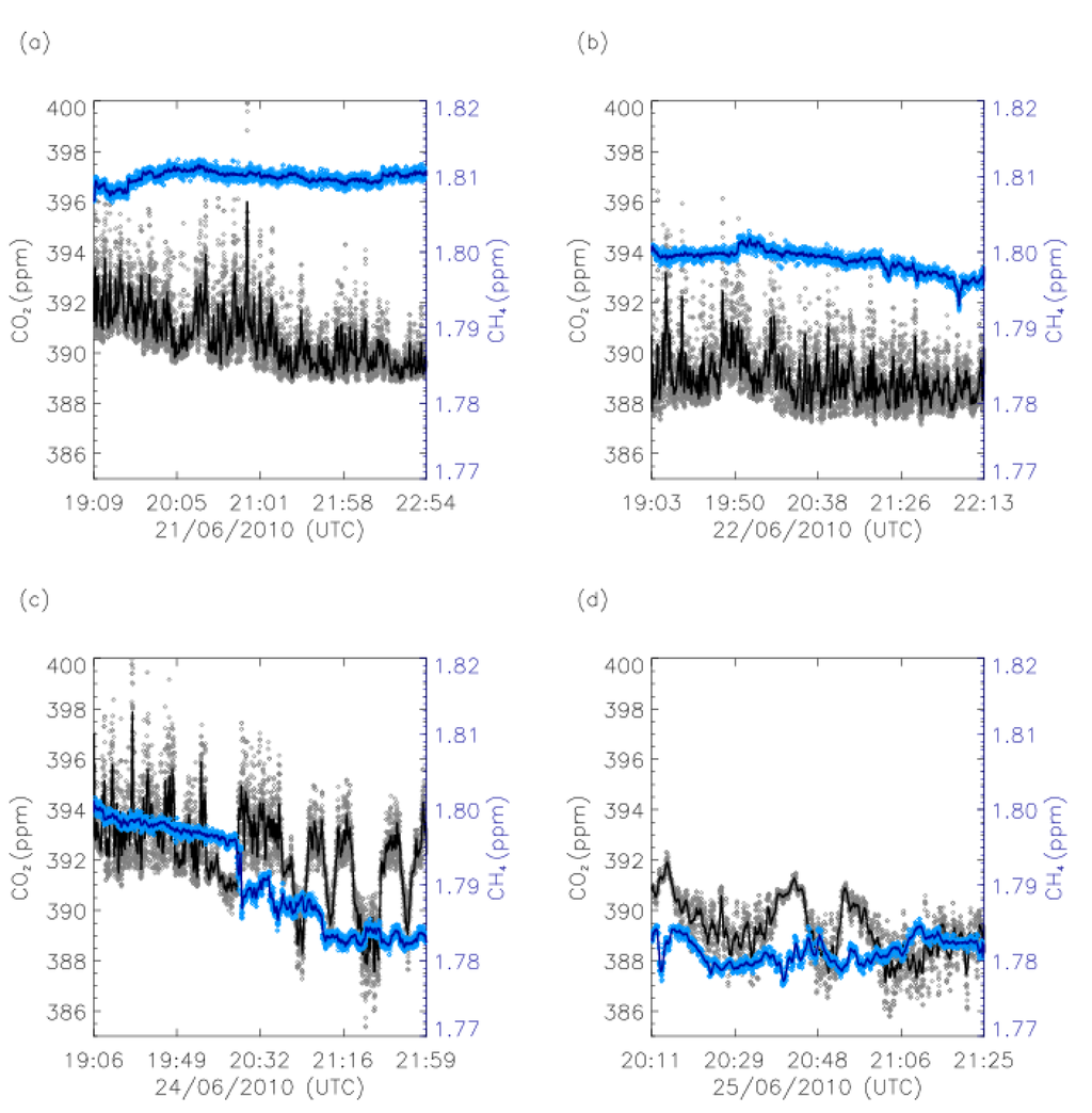 The RRV field campaign bracketed the summer solstice, from 20–25 June 2010, and coincided with the decreasing phases of the seasonal cycles of the CO2 and CH4. Data from the closest NOAA station at Wendover, Utah show that the CO2 and CH4 seasonal minima occur in August/September and July/August respectively ( www.esrl.noaa.gov/gmd/dv/iadv). The 2 s temporal resolution ground-based datasets of CO2 and CH4 are presented in Figure 1 for each GOSAT overpass day.
