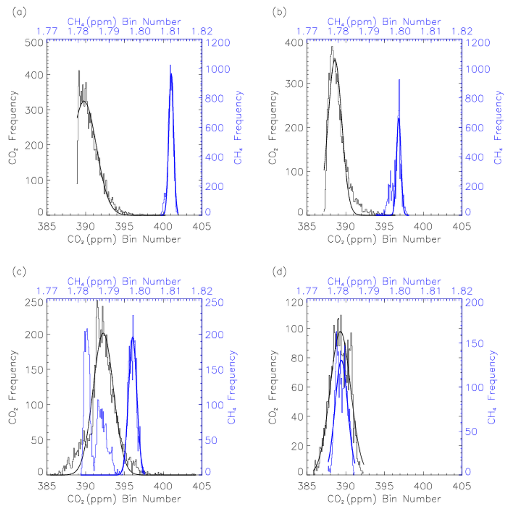 The measured CO2 and CH4 probability distributions during each GOSAT overpass day are shown in Figure 2. Superimposed on the Figure 2 histograms is a Gaussian probability distribution. The comparison of the actual and the Gaussian probability distributions, along with the statistical summary provided in Table 1, informs us that each histogram is positively skewed (with varying extents), with more data points lying to the right of the centre. The non-symmetric, positive skew of the histograms suggests there are more fluctuations of CO2 and CH4 concentration values above the mean concentration than below, indicative of potential local sources influencing the observations at this remote site.