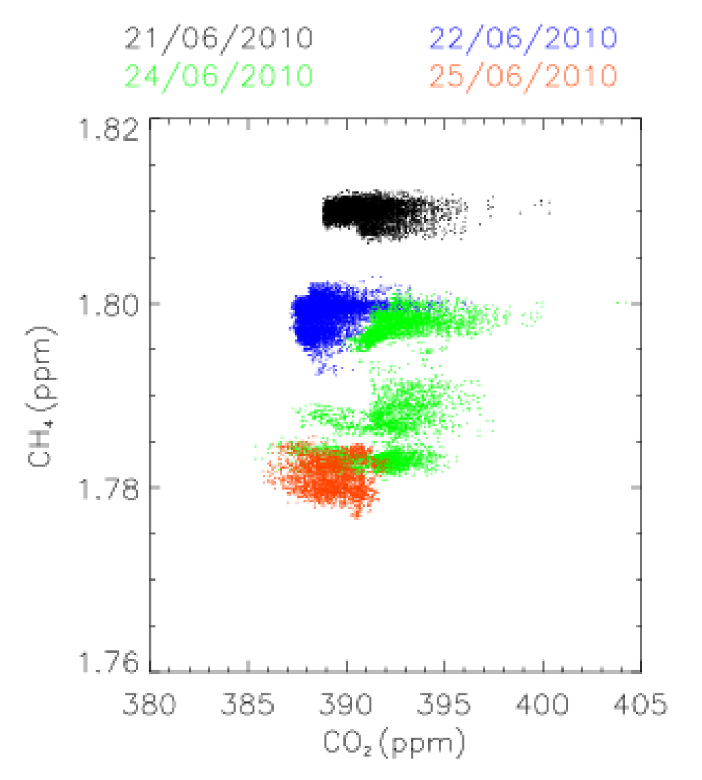 The histogram plot of CH4 on 24 June 2010 is bi-modal in shape, with two apparent peaks of similar occurrence frequency. This suggests that the data is from two separate processes or distinct sources, providing further evidence towards a local emission source. To investigate this possibility further a scatter plot of CH4 versus CO2 is presented in Figure 3. Excluding 24 June, it can be deduced from Figure 3 that the CH4 values on each day vary by less than 0.02 ppm (∼1% variation compared with background concentration value). Because, the day-to-day differences are larger than 0.02 ppm, each day's data falls into a distinct group bracketed by these small changes (0.02 ppm) in CH4 concentration. CO2, on the other hand shows much more daily variation, in the order of 20 ppm. This is a ∼5% variation when compared with the background CO2 value. On 24 June the CH4 measurements span a wider range of concentrations (2 ppm) and appear to have several distinct groups. The scatter plot further confirms that measurements on 24 June 2010 were influenced by two or more distinct sources with differing CH4/CO2 emission ratios.