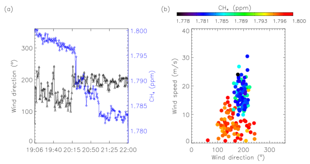 In contrast, the final two measurement days were characterized by increasing wind speeds in the afternoon (average wind speed: 12.64 m/s and 19.08 m/s on 24 and 25 June 2010 respectively, with gusts up to 30 m/s) from a more sustained and less variable, (100–250°) direction, particularly during the afternoon winds. Temperatures on these final measurement days remained above 30 °C, cloud cover was present, and humidity decreased (mean: 7.69% and 4.90% on 24 and 25 June respectively). Comparing wind data with CH4 mixing ratios on 24 June 2010 does indicate a relationship between CH4 mixing ratios and wind direction/speed. The decrease in CH4 concentration at 20:23 UTC on 24 June 2010 presented in Figures 1 and 2 coincides with a change in wind direction from SW (higher CH4 concentrations) to SE (lower CH4 concentrations) with wind speeds from the SW direction being lower than those from the SE. Figure 4 shows the relationship between CH4 and wind speed/direction (CH4 has been interpolated to the same temporal resolution as the wind data: once per minute) and points towards a local CH4 source in the SW region. The origins of the source are inconclusive. Small oil fields are located in RRV, however most appear to be towards the north and east of RRV playa. Other potential sources could include biogenic emissions from the soil or thermal springs; all possibilities, and the subsequent effects on the local environment, require further investigation. The same behavior was not observed for CO2; fluctuations in CO2 did not depend on wind direction/speed.