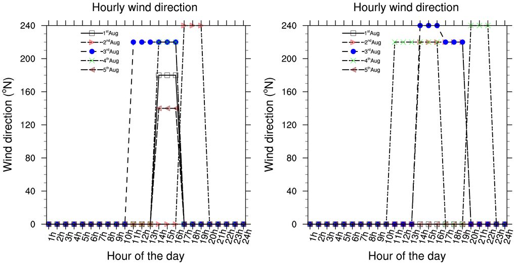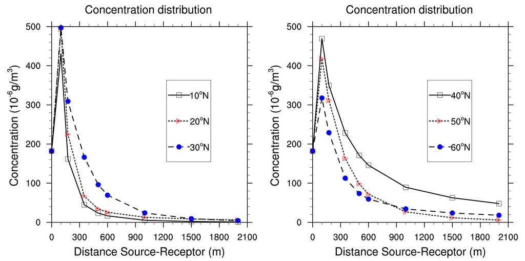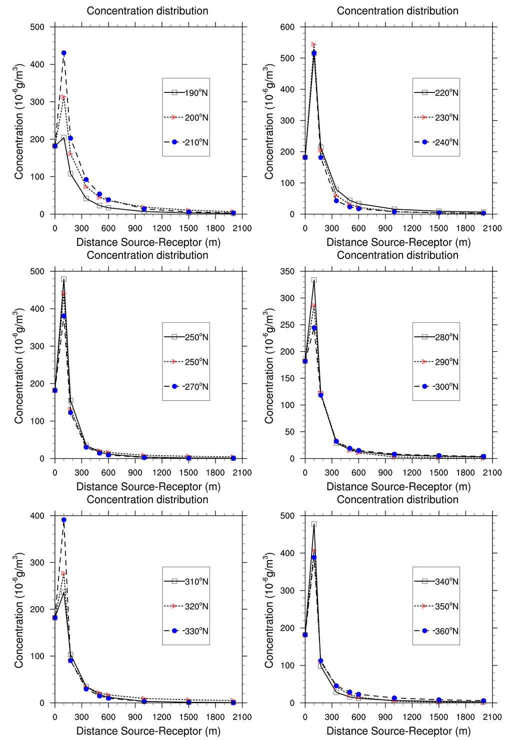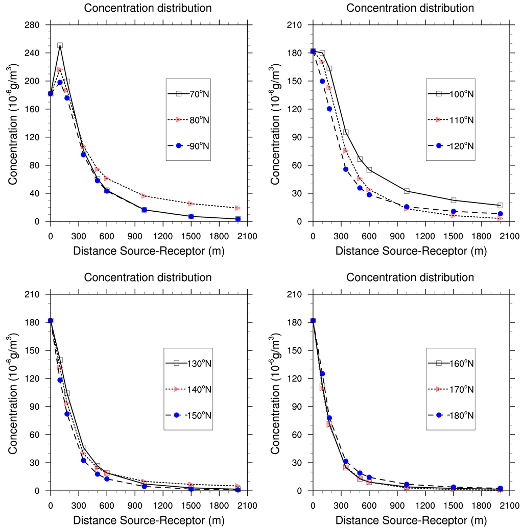 On the contrary, for receptors situated at the South-East sectors (100°N to 180°N), concentration are highest at the source, and decrease by dilution with ambient air to reach 1.41 μg/m3 at 1700 m from the source. Meteorological conditions are dominated by strong winds and low pressure (unstable atmosphere) which rapidly disperse air pollutants around the source. Atmospheric dispersion is then regulated in Planetary Boundary Layer (PBL) by advection transport through the average flux of wind and turbulence [26,27].
