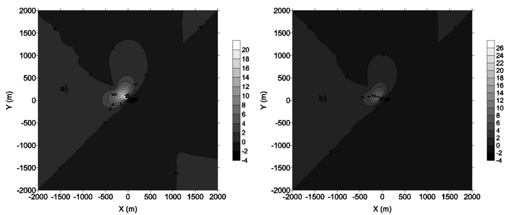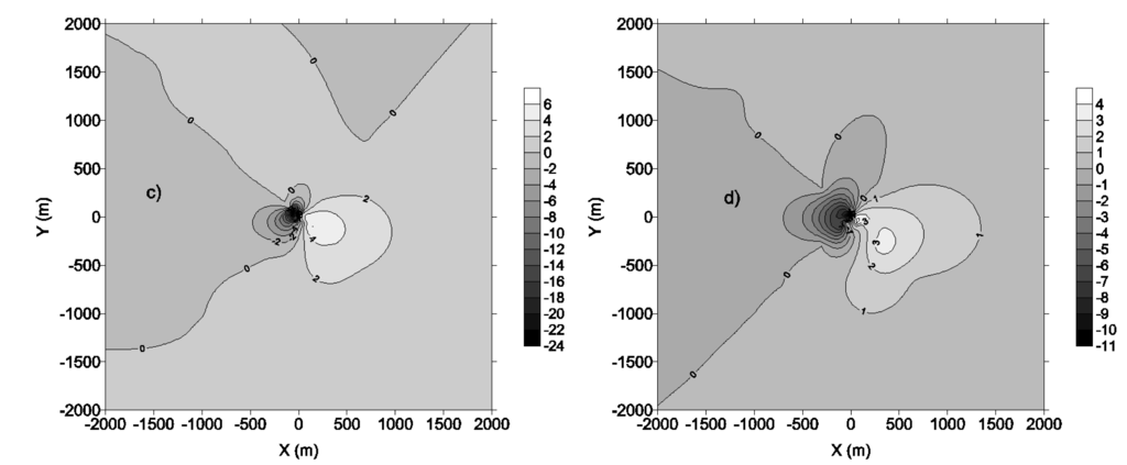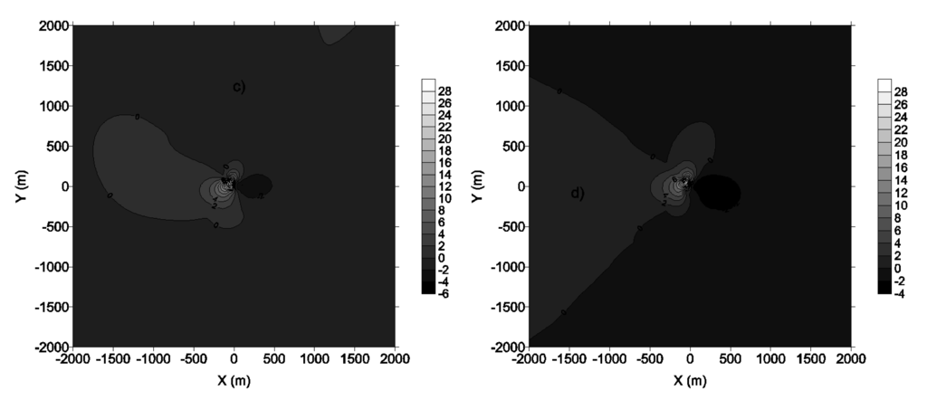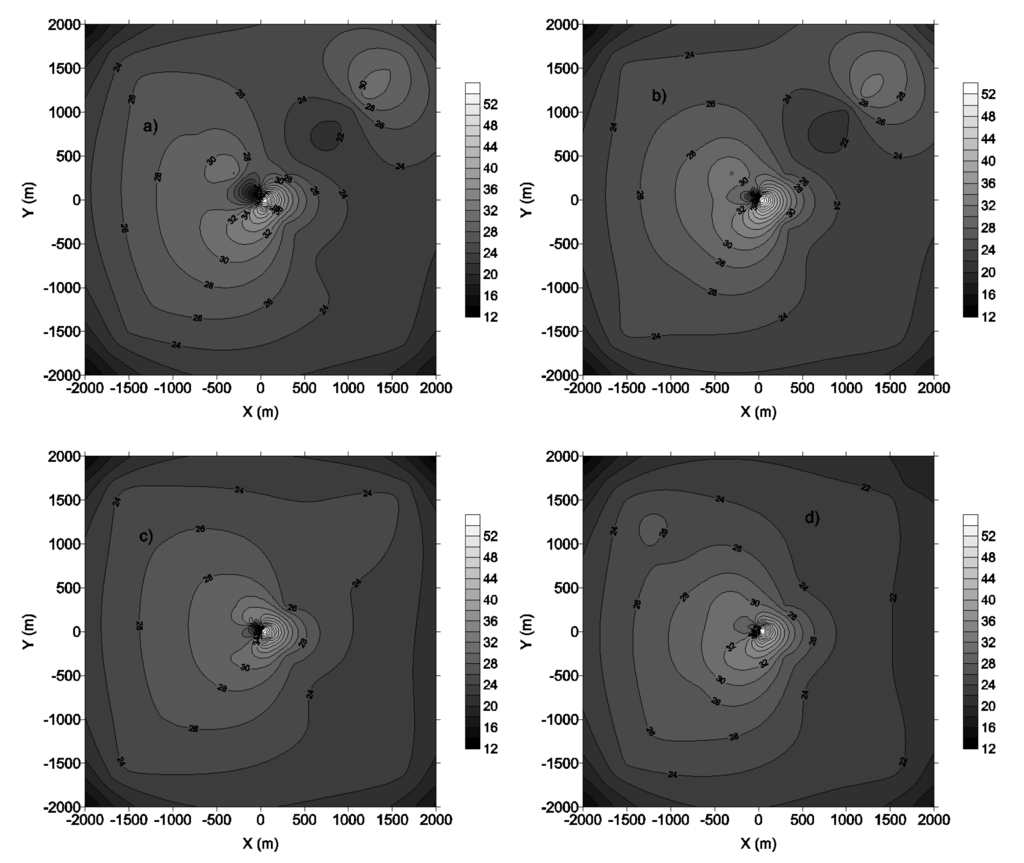 The greater the soil's albedo, the thicker and the cooler the air masses near the ground. An increase in albedo leads to a decrease in the sensible heat flux, the friction velocity, the Monin–Obukhov length, the convective and the mechanic mixing heights. And yet the potential rate temperature increases. The first highest 3 hour averaging time concentration patterns (Figure 12a) behave differently from the others in Figure 12. Figures 12b–d reveal a decrease in concentration patterns of about 16%, 24% and 11% respectively, while Figure 12a shows an increase in the concentration patterns. This may seem contradictory, but a close look at the results reveals a decrease in the air concentration when albedo increases. The effects of changes in albedo are to be considered for the second highest concentration which is the criterion for most regulatory standards in the United states [6].