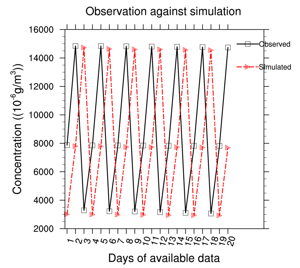 Daily in situ observations data have been collected from the Cameroonian's Ministry of territorial administration and decentralisation, direction of civilian protection. Since AERMOD just produces highest mean concentrations for the a given period (3 h for example) and indicates the dates at which they occur, we have collected data corresponding to the first 20 maximum average concentration values for a period of 24 h. The outputs discussed here is the base case presented in the Table 2. Figure 15 represents the observed concentration of NOx against simulated. The model underestimates the simulated NOx concentration. For the twenty data we recorded, the Root Mean Square Error (RMSE) is about 2.91. It comes out that the model does not reproduce satisfactory the real case pollution over Douala. This is due to lack of meteorological data.