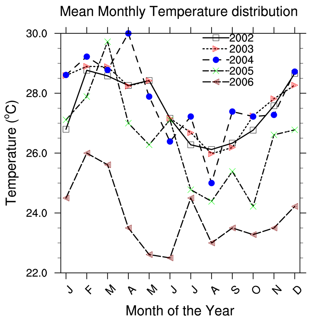 Presented below Figure 2–8 are the daily wind direction and speed for the first five days of the months of January, May and August for each year and the mean monthly average temperature for the years 2002 to 2006. We have selected the first five days of each month because daily variation in these data are not very important and the months have been selected to cover all the different season of Cameroon. We see from these figures that dominant wind direction is around 220°N to 270°N and occurs between 10 a.m. and 8 p.m., most frequently at 3 p.m. Winds are fairly strong between 9 a.m. and 8 p.m. and are calm for the remaining time. Maximum temperature occurs between February and April, while minimum occurs in August. One average, the year 2004 was the warmest and had registered the strongest wind speed with a value about 55 knots, while 2006 was the coldest one.
