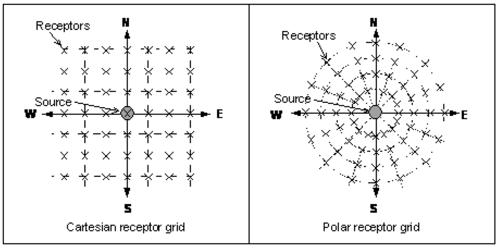 Concentrations are computed on 36 receptors located in a polar and a cartesian grid which spread from 0 to 2000 m to the source (Figure 9).