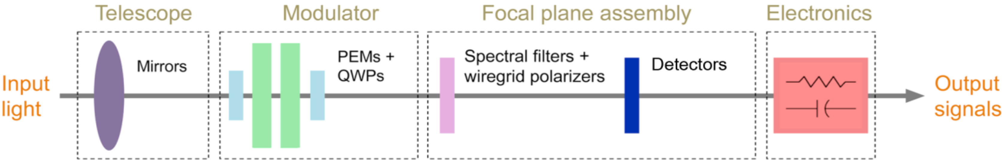 The main elements of the Multiangle SpectroPolarimetric Imager (MSPI) polarimetric imaging approach are the telescope, the dual- photoelastic modulator (PEM) retardance modulator, the focal plane assembly, and electronics.