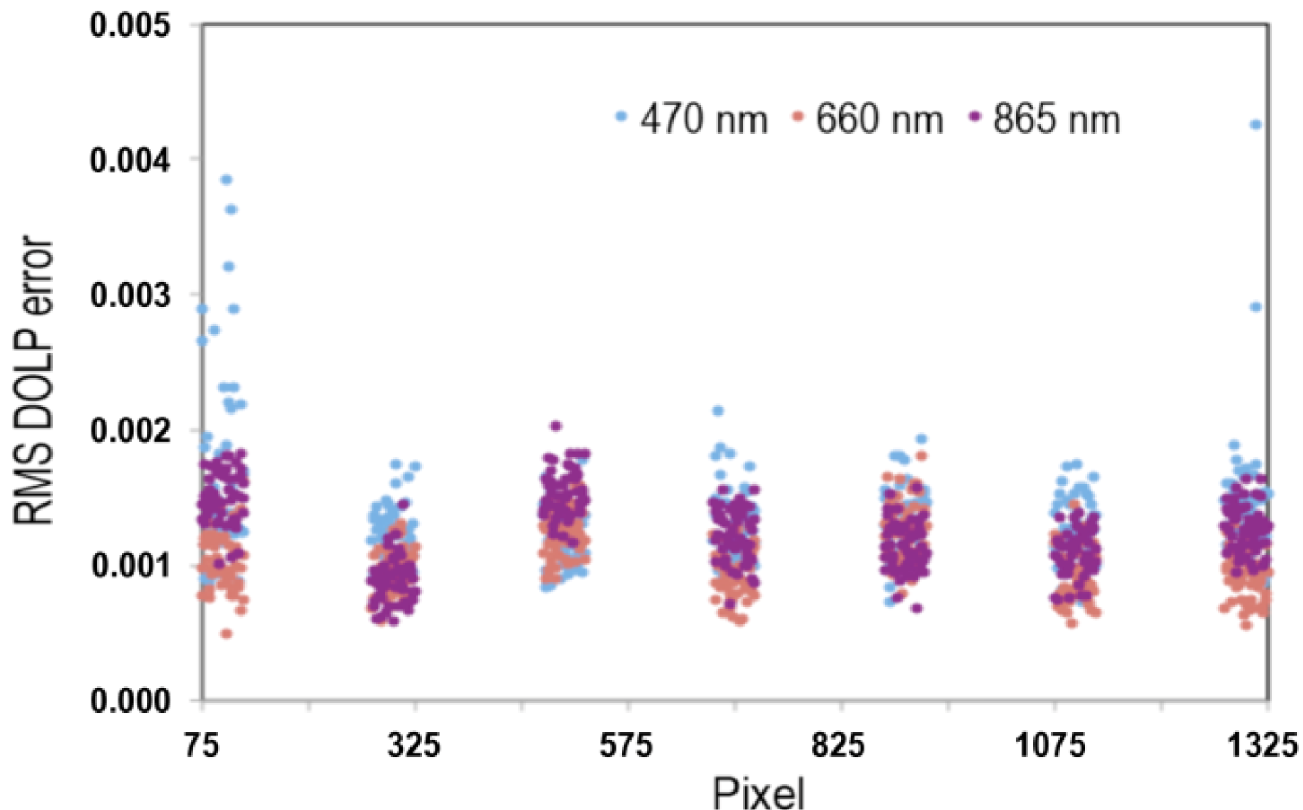 Figure 2 shows residual DOLP error for seven segments of the line arrays at 470, 660, and 865 nm. With the exception of a few pixels near either end of the focal plane, RMS DOLP error is typically <0.002, and the 0.005 specification is met even for the outlier pixels.