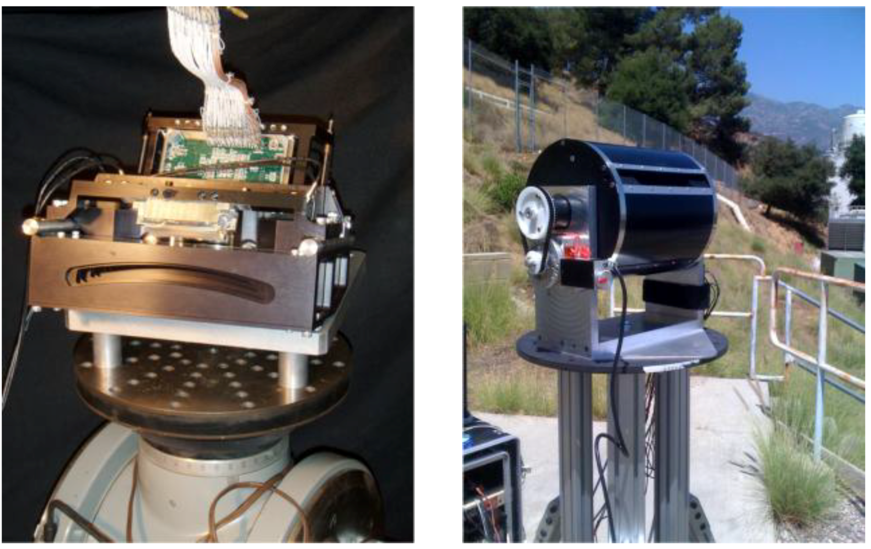 As GroundMSPI is a pushbroom camera, two-dimensional imagery of landscapes and skyscapes is acquired by mounting the camera in a drum and rotating the field of view about a horizontal axis. The gimbal is driven by a commercial micro-stepper rotary stage (Aerotech ART100) and scanned vertically from below the horizon toward the zenith at a rate of 0.5° s