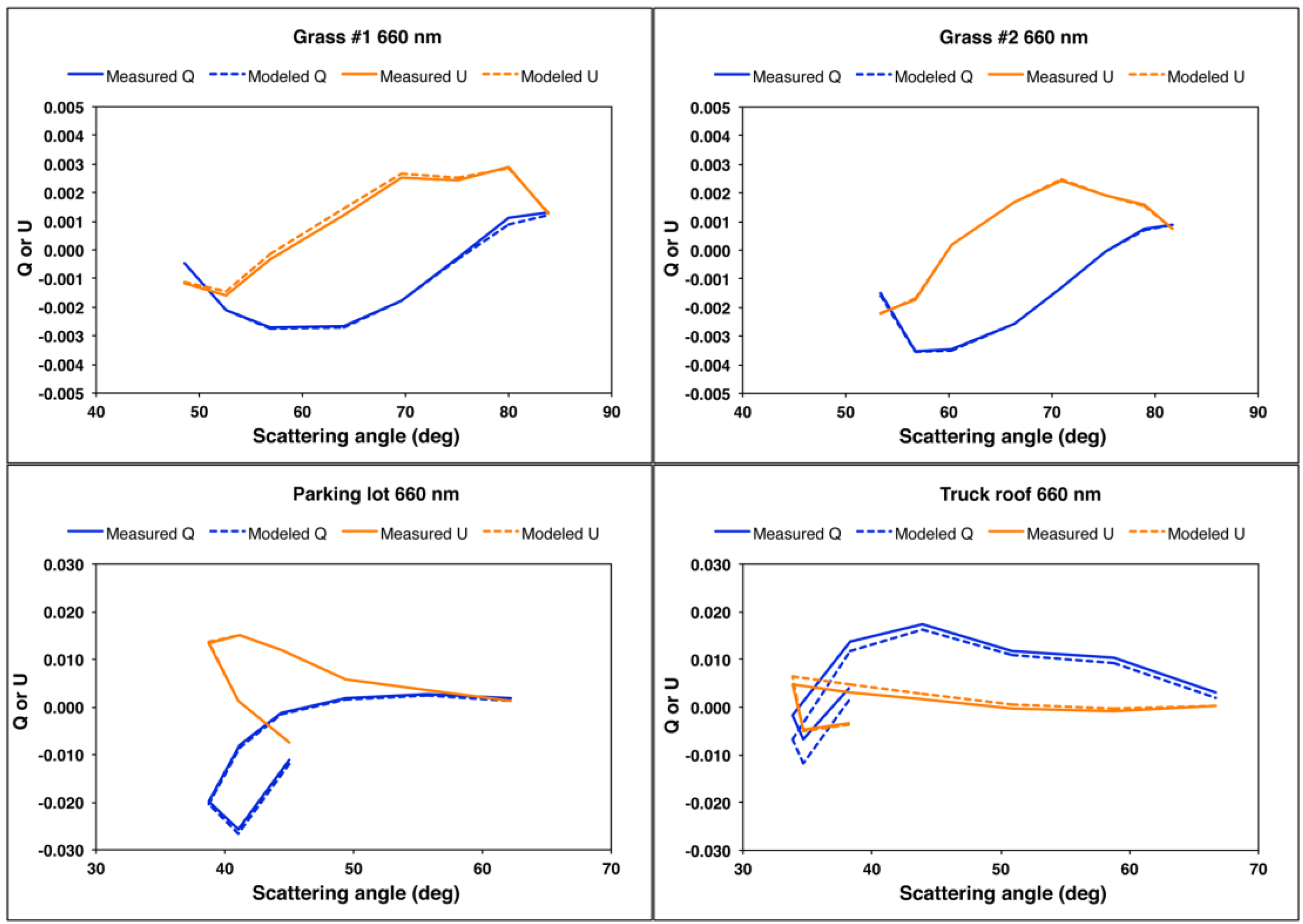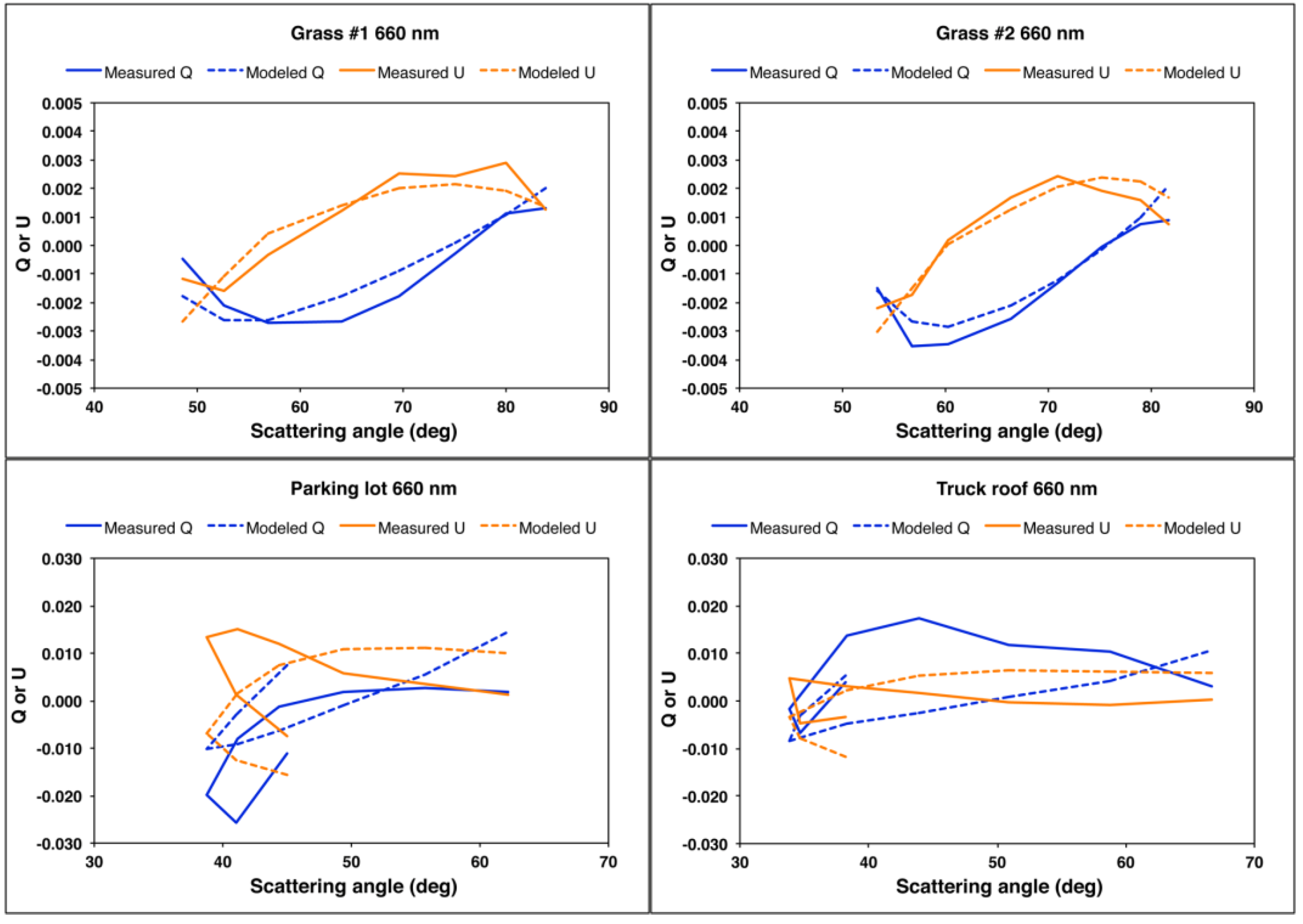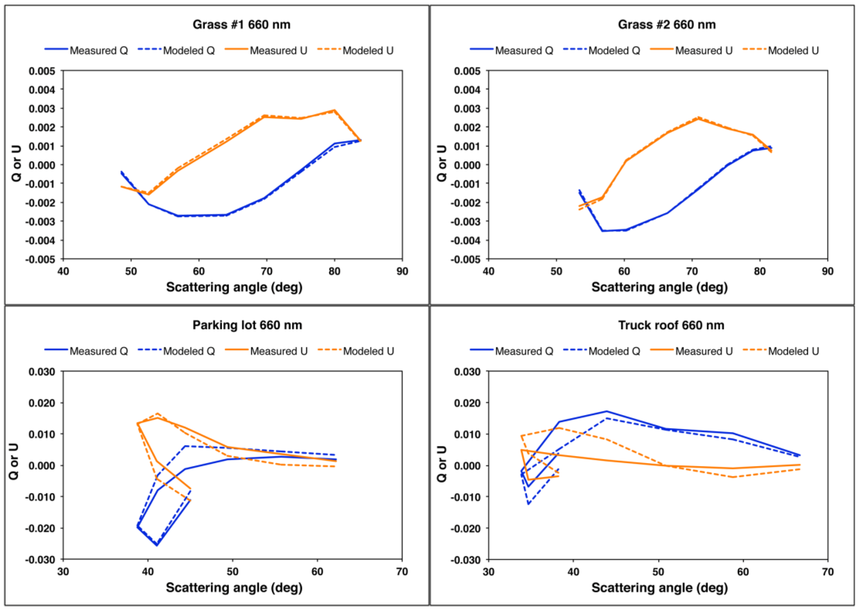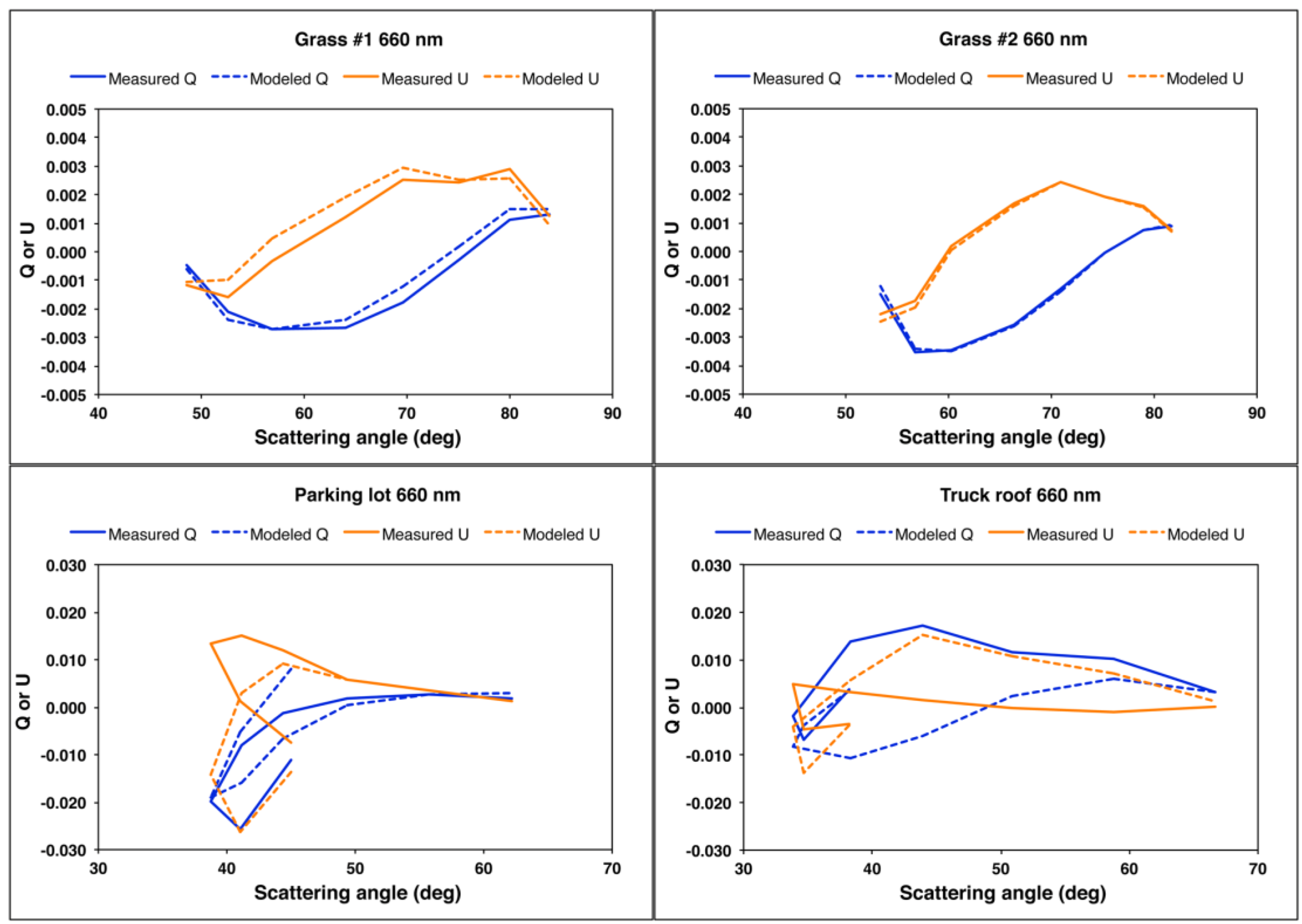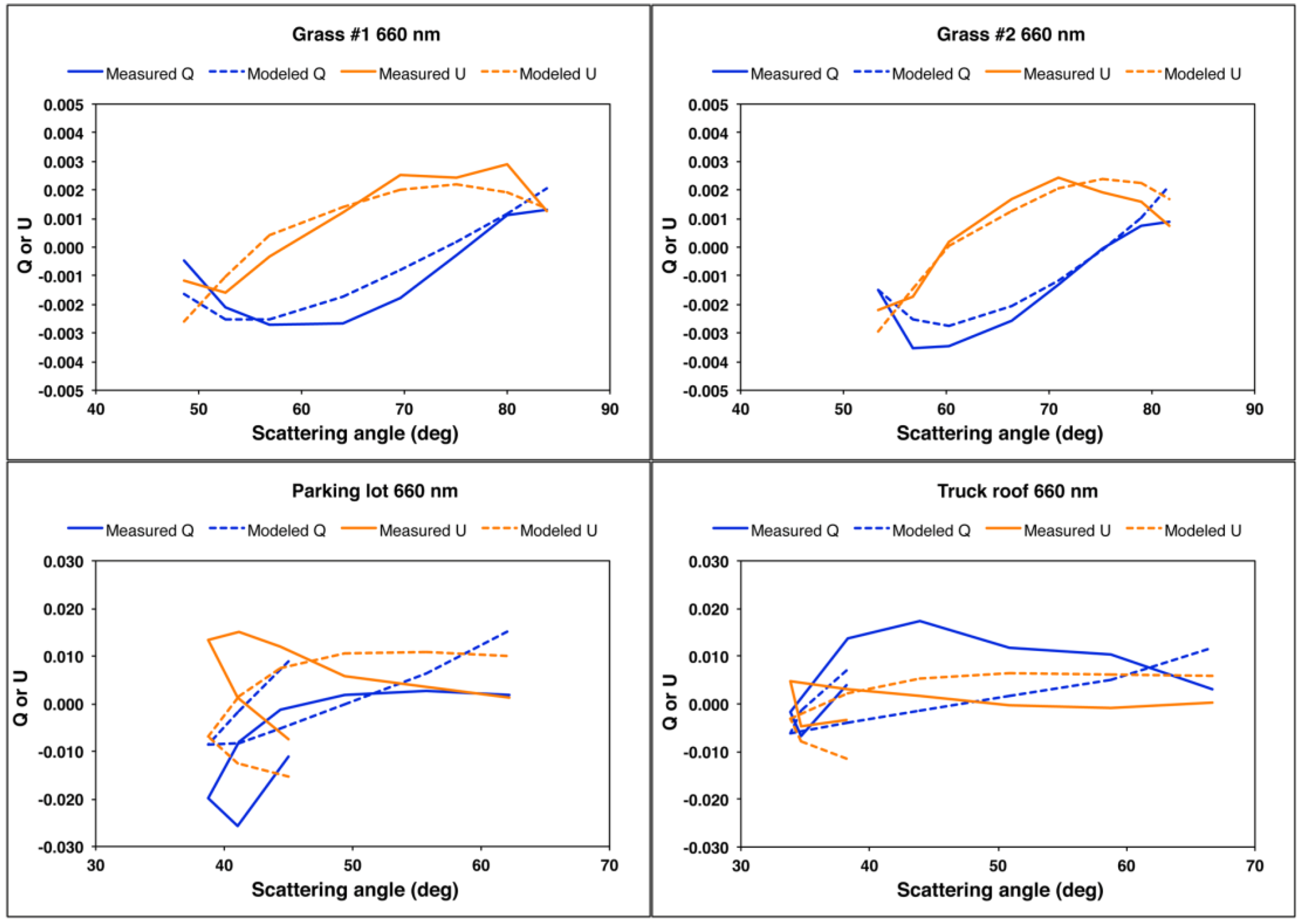 U is obtained from least-squares analysis. No weighting is applied to the three spectral bands. We obtain the values 0.23, −0.05, −2.44, and −11.62 for grass #1, grass #2, the parking lot, and the truck roof, respectively. Without a physical model for the generalized microfacet Mueller matrix, it is not possible to assess the physical realism of these values.
