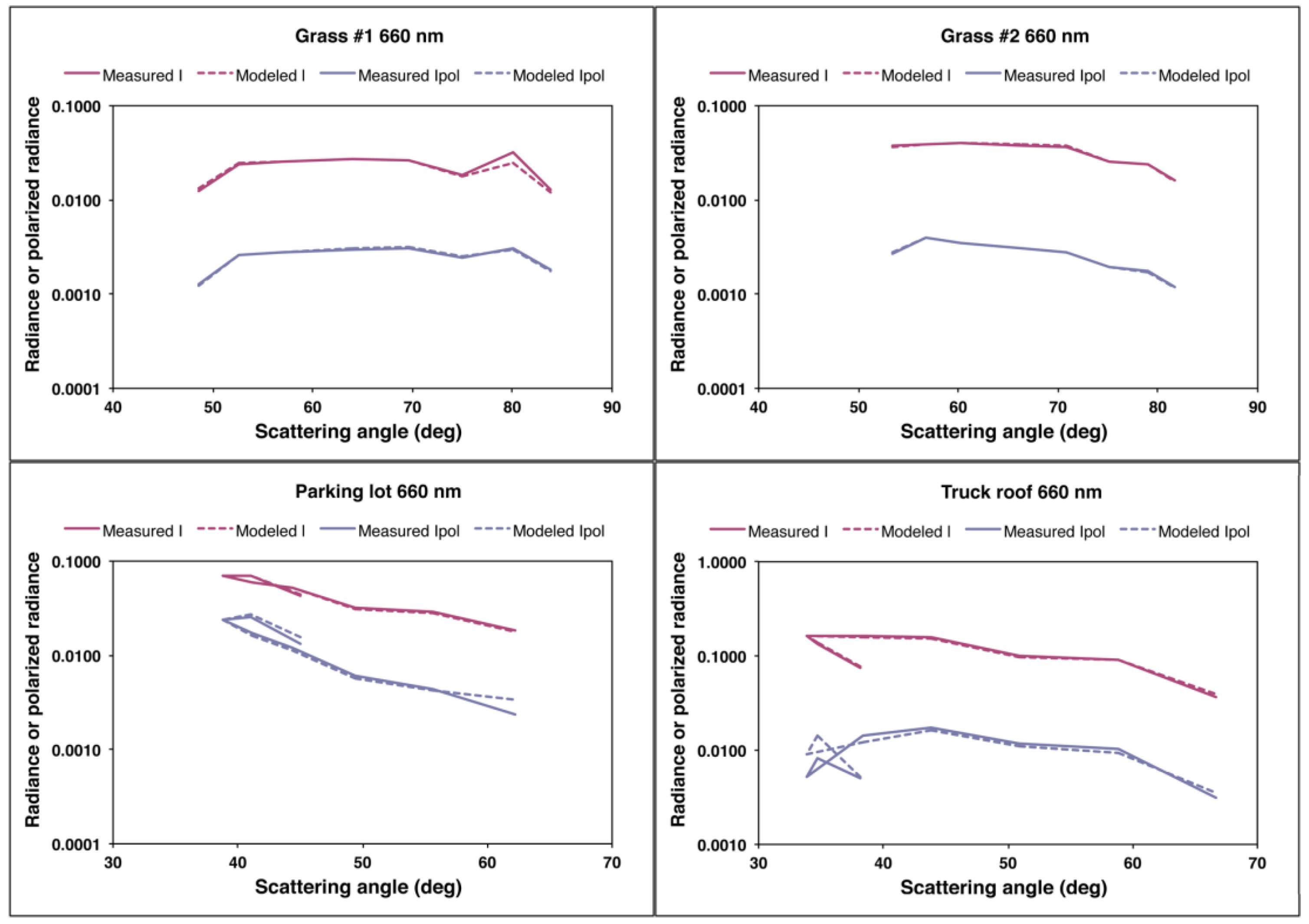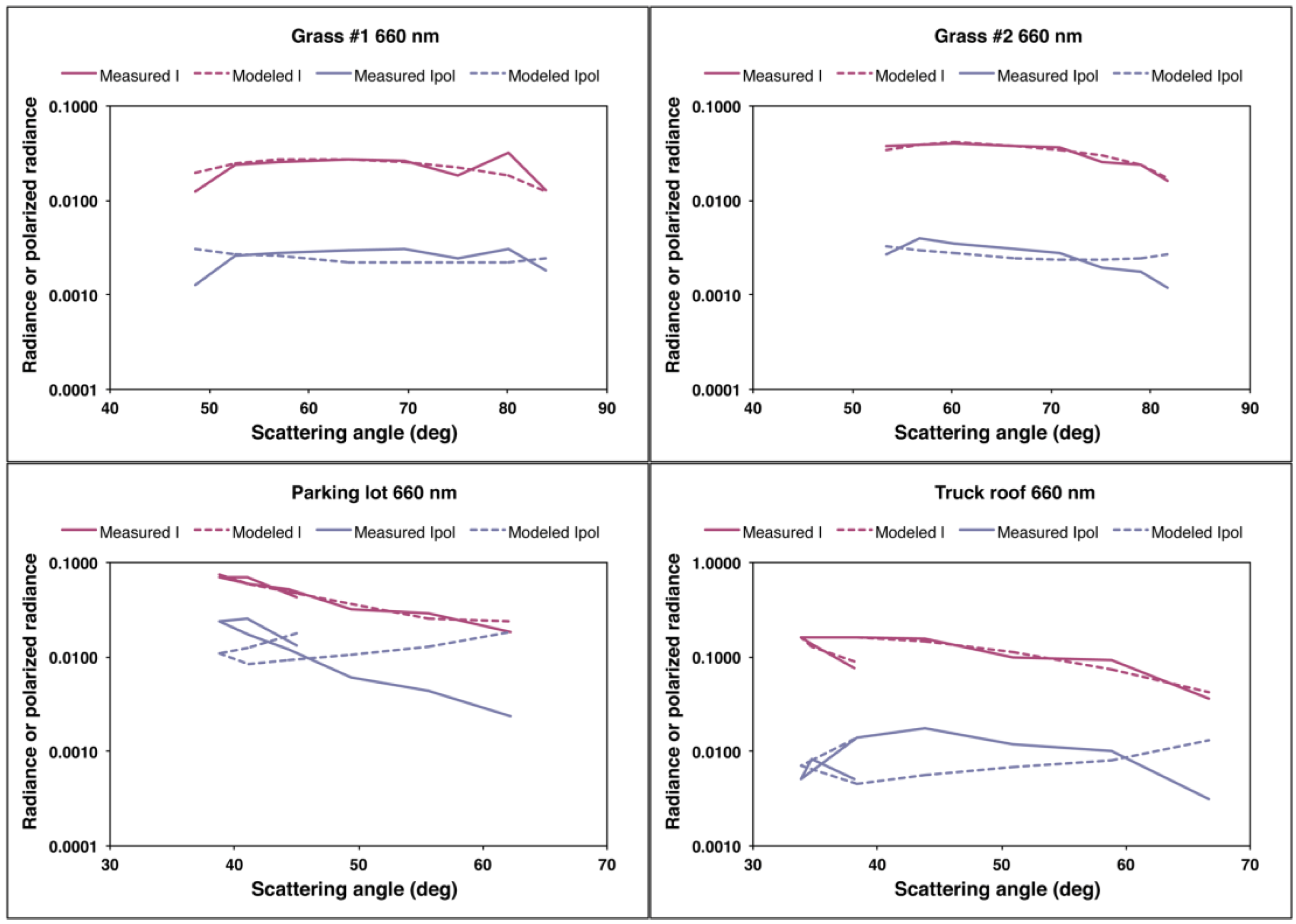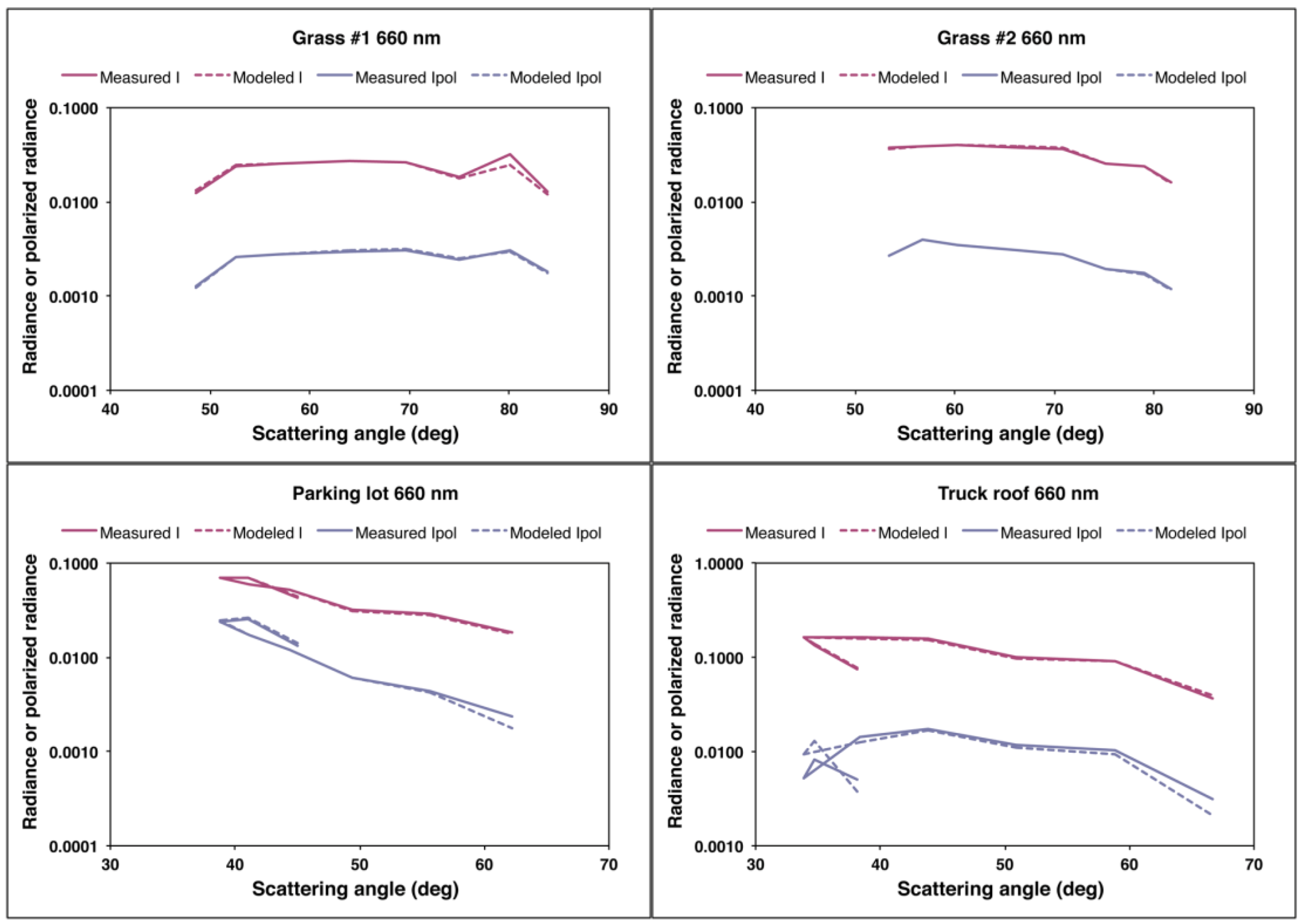Figure 8 show that the analytic form of the PBRDF does not match the measured values, particularly for the manmade targets. In contrast to the randomly oriented grass stalks, the surface of the asphalt parking lot and truck roof likely violate the assumption of azimuthal isotropy in