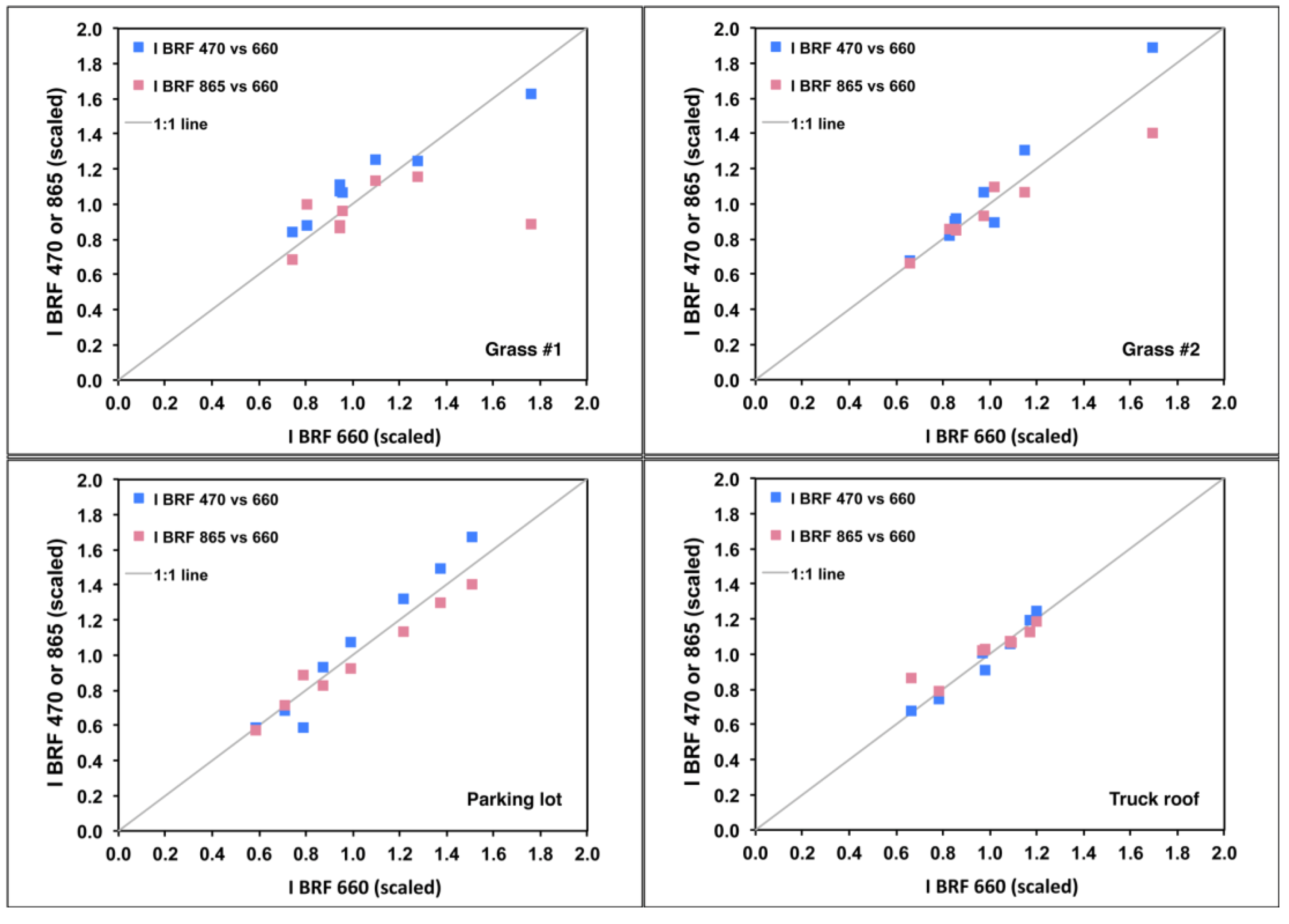 BRUF at 470 and 865 nm against the corresponding values at 660 nm. For convenience, the scaling involved division by the wavelength-independent parameter ξ, but any wavelength-independent scale factor could be used. Because this scale factor does not depend on wavelength, adherence of the results to the 1:1 line indicates that both the magnitude as well as the angular shape of
