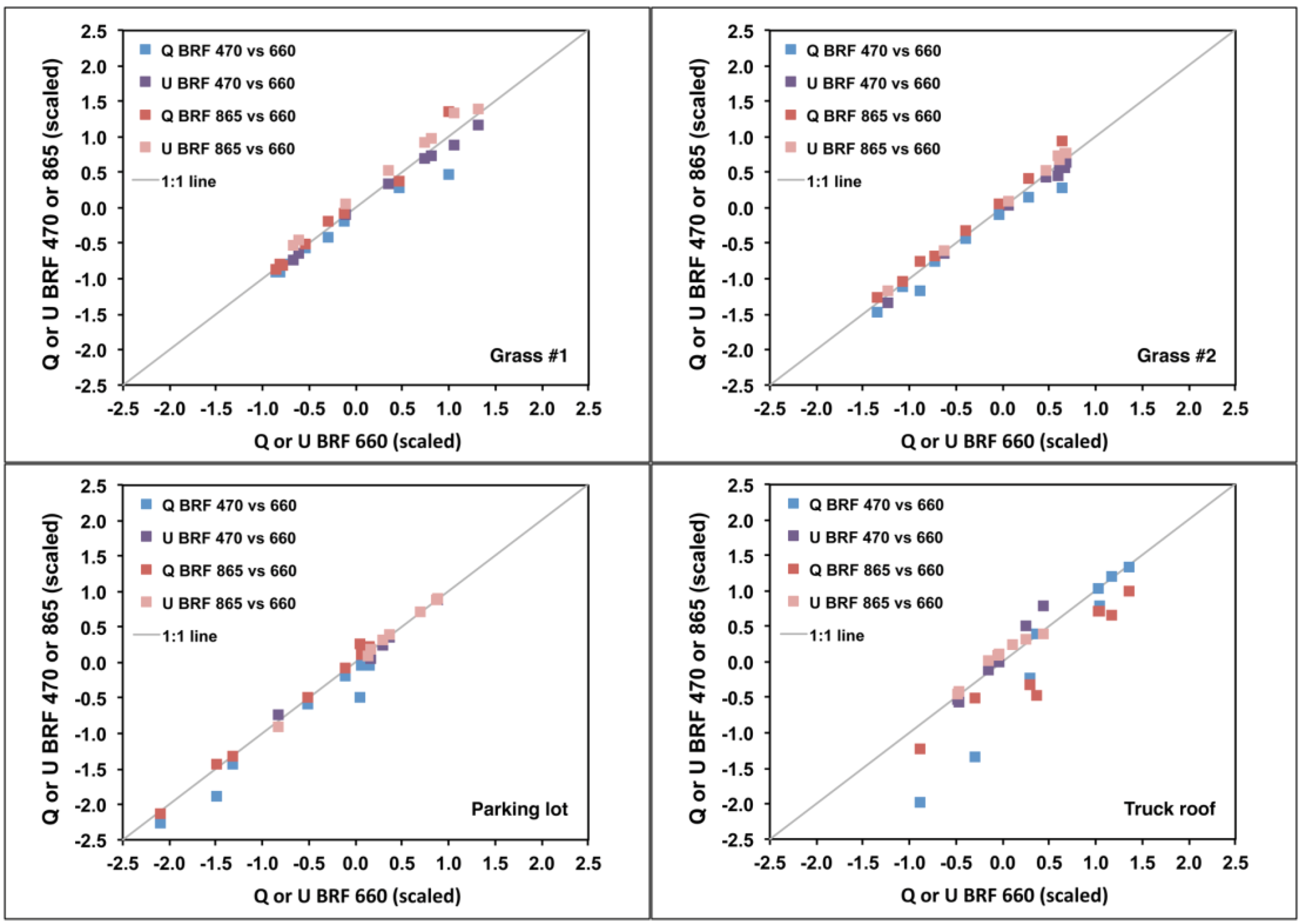 Polarization-domain BRFs at 470 and 865 nm, normalized by the spectrally invariant ξ scale factor, plotted against corresponding values at 660 nm. The various points correspond to data acquired at different times of day. The majority of points fall on the 1:1 line, indicating that both the magnitude and angular shape of the BRFs are spectrally neutral. The largest departures are observed for the truck roof.
