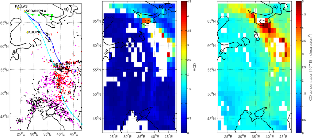 (a) air mass trajectories at three levels (500 m ASL (green), 1,000 m (blue), 3,000 m (magenta)) for 30 July and the fires detected by MODIS on 28 July (yellow), 29 July (red) and 30 July (black). The trajectories are for 48 h and the time difference between the symbols is six hours. (b) daily averaged AOD (level 3) from MODIS (Aqua) for 30 July. (c) AIRS (Aqua) total CO concentration (1018 molecules/cm2, level 3) on 30 July 2010.