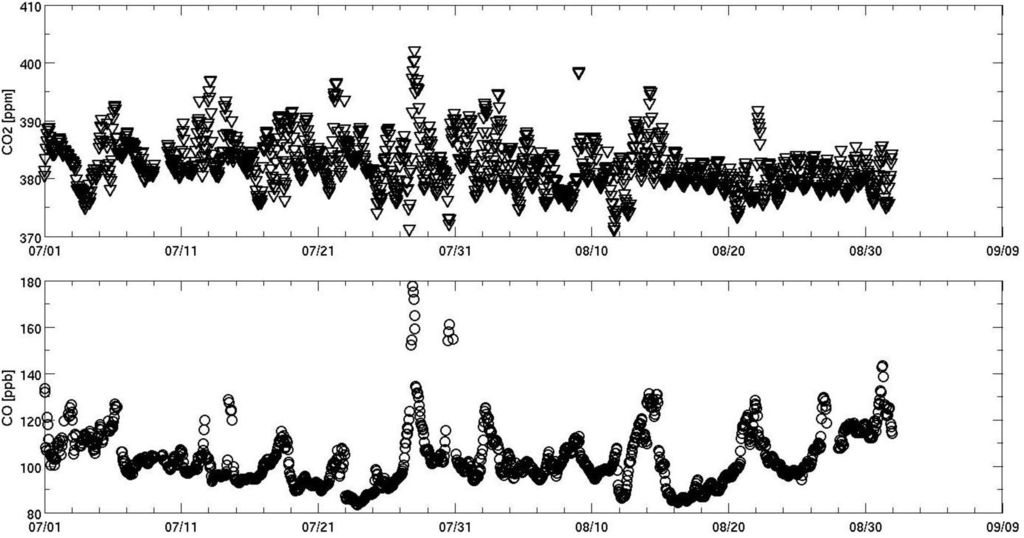 Figure 3 presents a time series of CO2 and CO mixing ratios measured at the Pallas site. Typically, CO is a better indicator for biomass burning plumes than CO2 because CO2 is constantly emitted from anthropogenic sources. However, the CO2 data shows a small peak (405 ppm) during the night between 27 and 28 July. The CO data also has a peak (180 ppb) at the same time. In addition, CO data has a peak (160 ppb) on 30 July. Enhanced CO values were also detected at Sodankylä on the same days, as discussed above (Figure 2).
