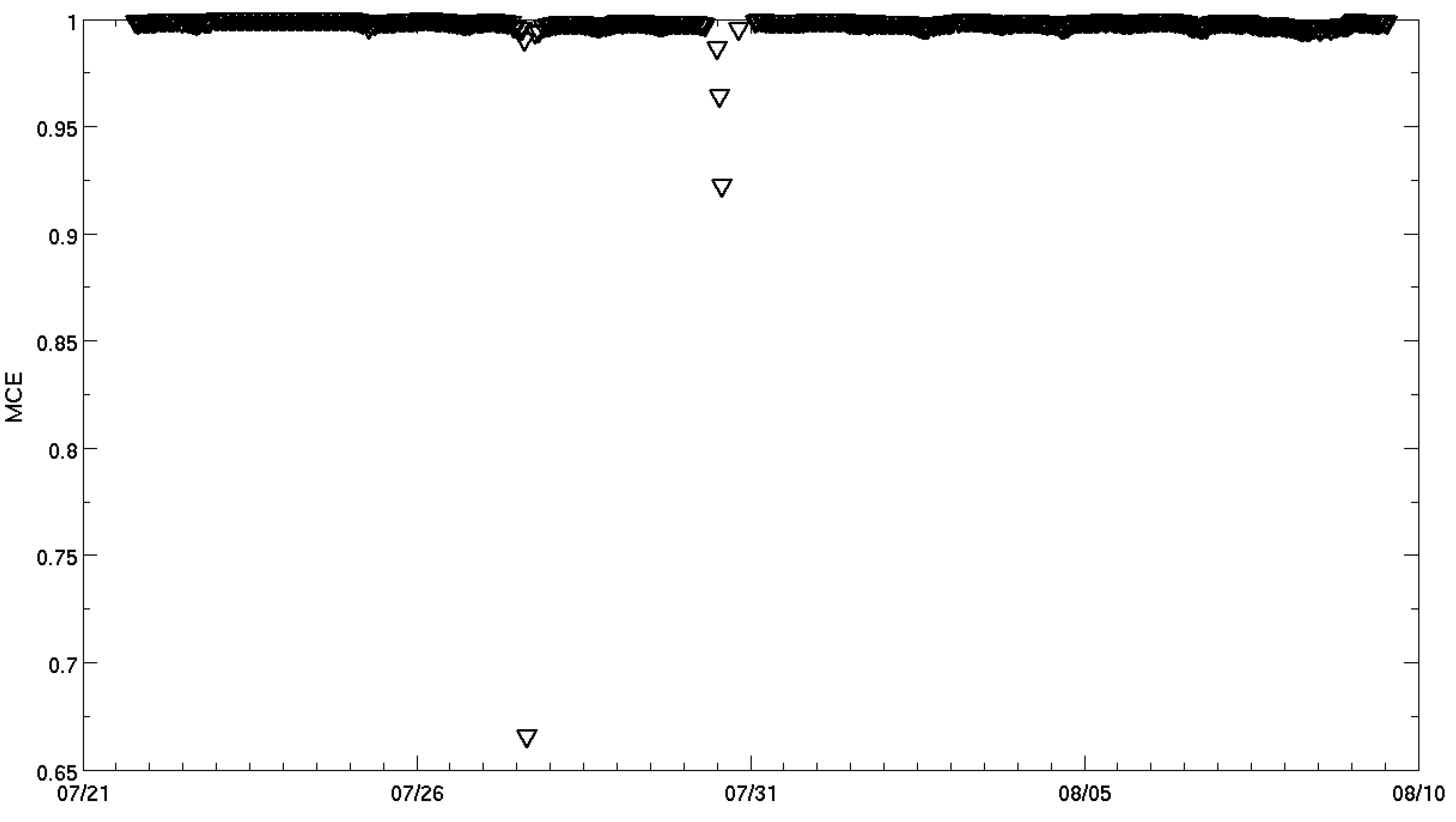 where ΔCO and ΔCO2 are the excess molar mixing ratios of CO and CO2 for the smoke plumes. In order to calculate these excess quantities, we assumed that the ambient concentrations of CO and CO2 were equal to the minimum value measured in July 2010. MCE can be used to distinguish between flaming and smoldering combustion. When MCE is larger than 0.9 the emissions are from flaming combustion; when it is below 0.9, the combustion is thought to be smoldering [48].