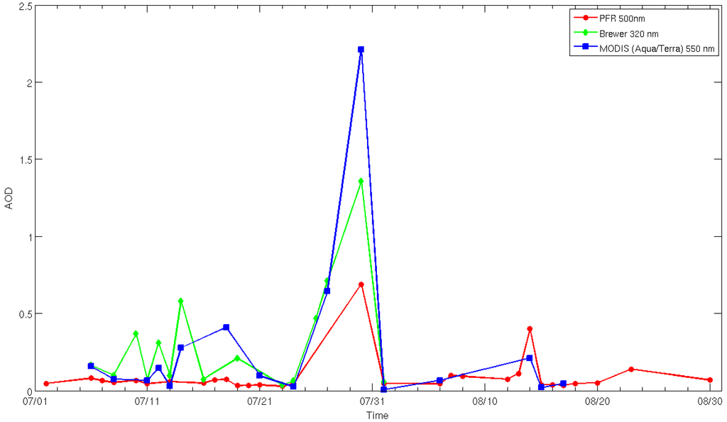 The daily averaged AOD measurements from the MODIS, PFR and Brewer instruments are shown in Figure 5. MODIS and PFR are measuring in the visible and Brewer measures in the UV. All instruments show a dramatic increase in AOD during 30 July with around four times larger values than usual. Mei [3] reported similar increases in AOD during this episode. Typically, the AOD values in Sodankylä (measured with PFR) are around 0.08, therefore, the increase to 0.6 is already a significant change. However, as Figure 6 illustrates, the daily averaged PFR AOD value is based on measurements from the morning and the afternoon, thus, the largest impact of the plume is missed, due to strict cloud screening. MODIS, on the other hand, has a measurement also from the thickest smoke plume (AOD up to 4.5). This explains the large difference in the daily averaged AOD values for 30 July. MODIS and PFR measured almost simultaneously at around 9 a.m. UTC and show excellent agreement (Figure 5). Mielonen [10] presented MODIS AOD values from around 1 p.m. from eastern Finland (Kuopio) on the previous day (29). This indicates that the thickest part of the smoke plume did not reach Kuopio that day, but it passed Kuopio from the north and arrived at Sodankylä on the following day. Figure 4 also shows that MODIS and Brewer detected enhanced AOD values on 27 July (PFR did not measure during this day), thus indicating that there might have been some smoke in Sodankylä on that day as well. The enhanced CO mixing ratios measured at Sodankylä and Pallas during the same day and the following night support this conclusion.