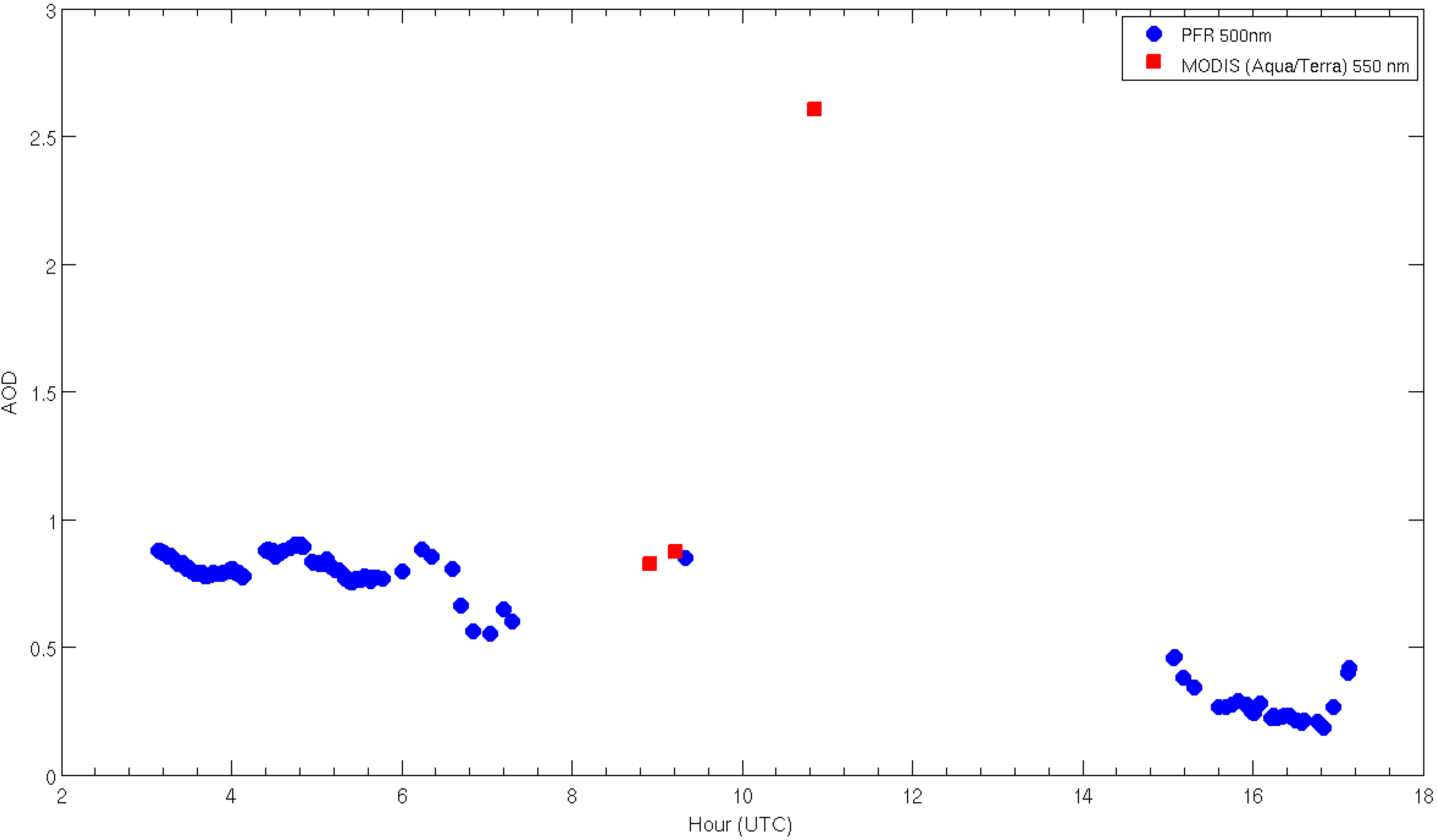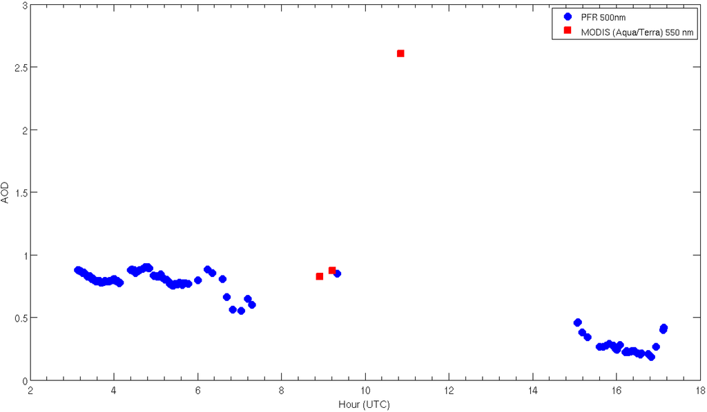 AOD values measured in Sodankylä with PFR (500 nm), and MODIS (550 nm) on 30 July 2010.