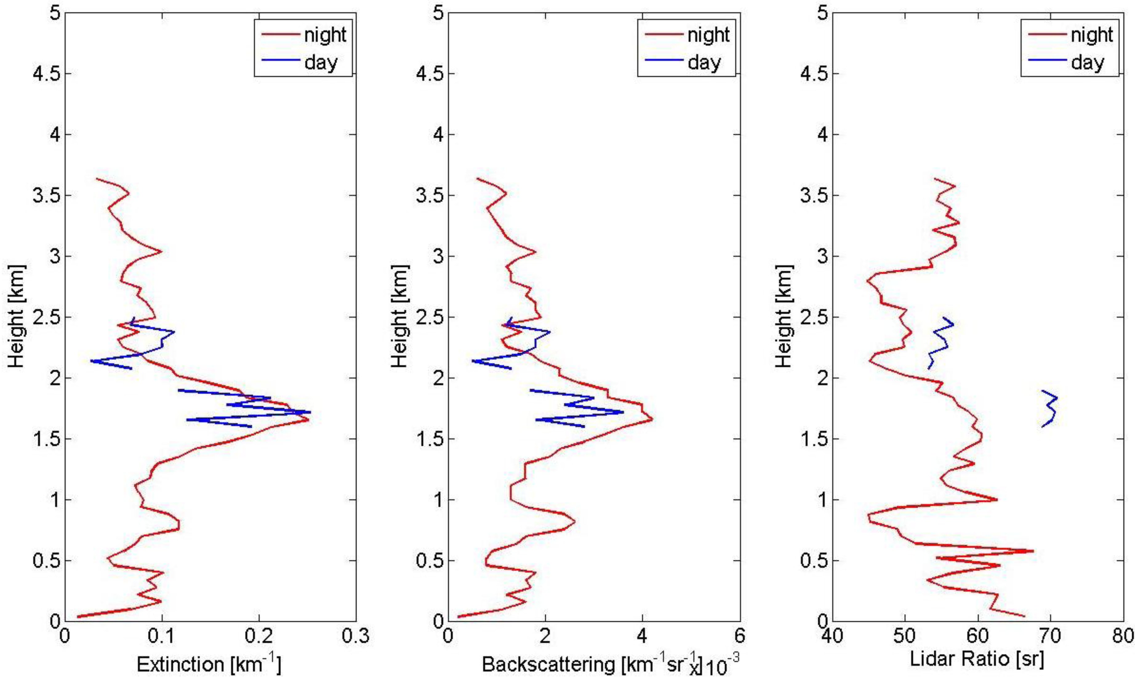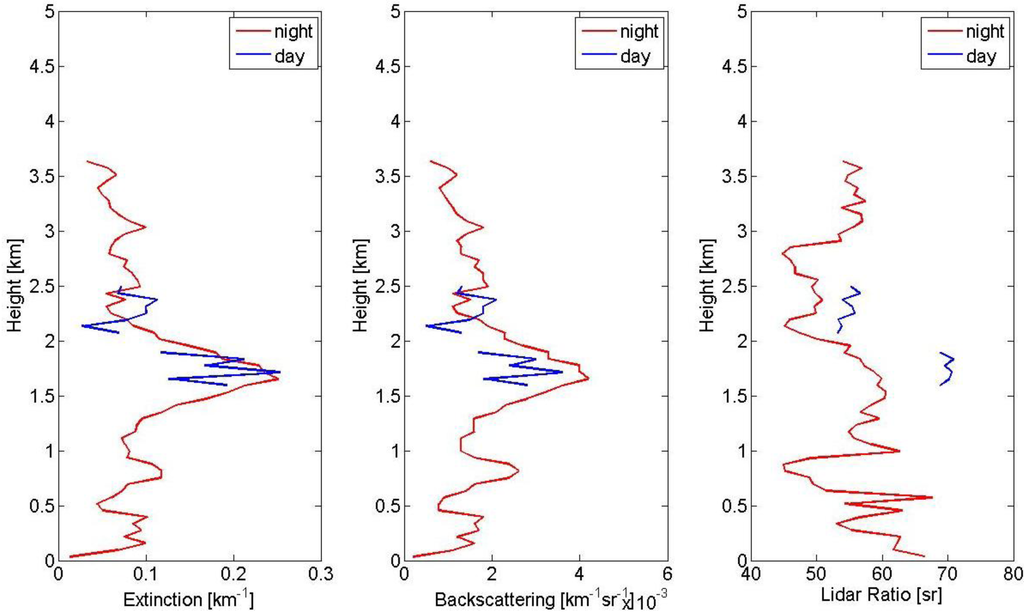 The average extinction, backscattering, and lidar ratio profiles on 30 July 2010. Nighttime measurements (at 1:11 a.m. UTC) in red, and daytime measurements (at 10:53 a.m. UTC) in blue. The measurements were done between latitudes 67.0 and 67.5.
