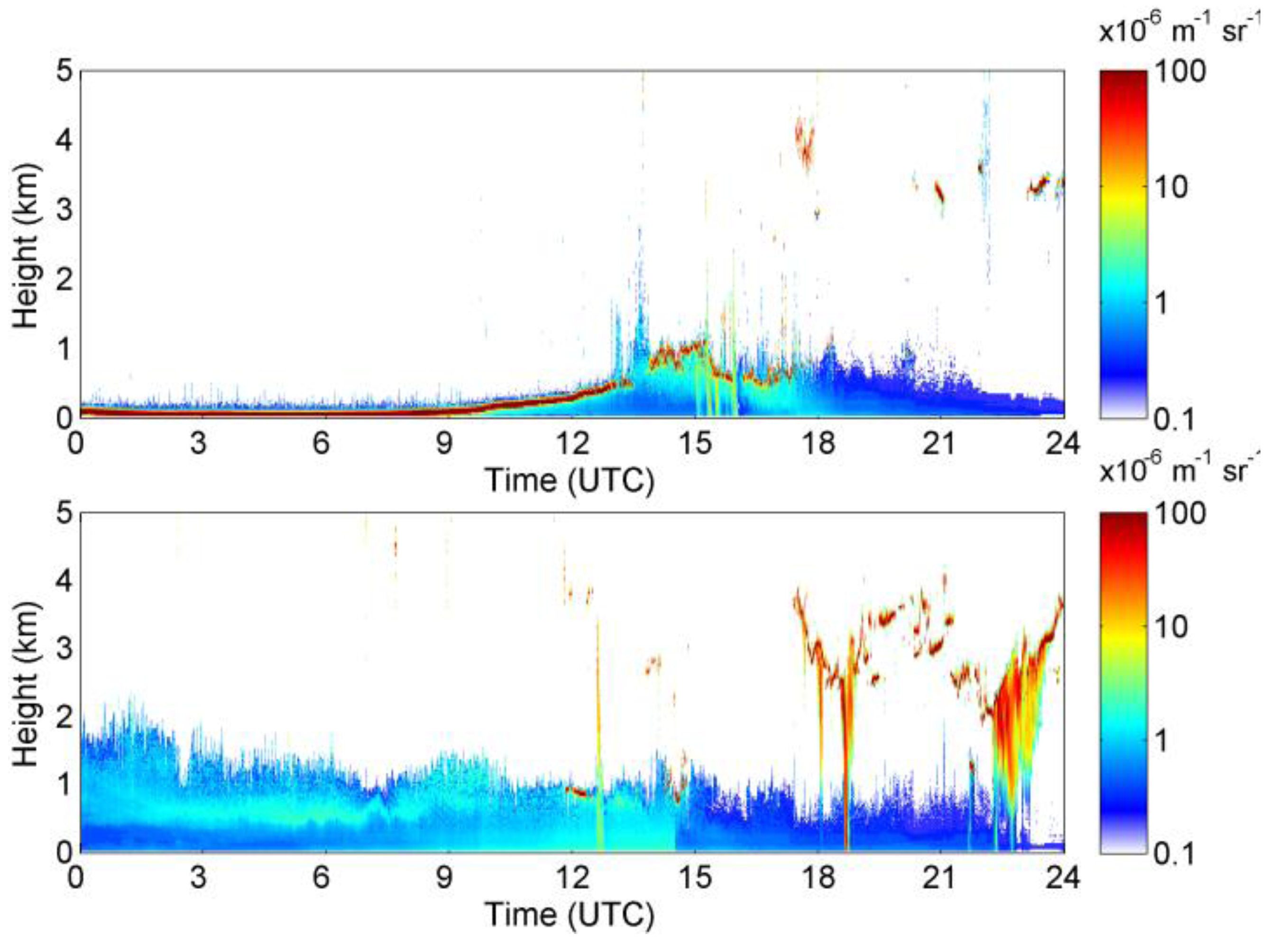 The Cloud-Aerosol Lidar and Infrared Pathfinder Satellite Observation (CALIPSO, [37,38]) satellite was launched in April 2006, and data has been available from June 2006 onward. CALIPSO carries the Cloud-Aerosol Lidar with Orthogonal Polarization (CALIOP) instrument, which can measure the vertical structure of the atmosphere at three channels, from the intensity of that part of the (pulsed) laser light that is scattered back to the lidar receiver. Two of these channels, at 532 nm, are orthogonally polarized, and one channel measures the total backscattered signal at 1,064 nm. The diameter of the laser pulse at ground level is about 70 m. CALIOP has a spatial resolution of 333 m along the orbital path. The satellite repeat cycle is 16 days [39]. We used level 2, version 3.1, aerosol profile products (backscattering and extinction at 532 nm) in the analysis.