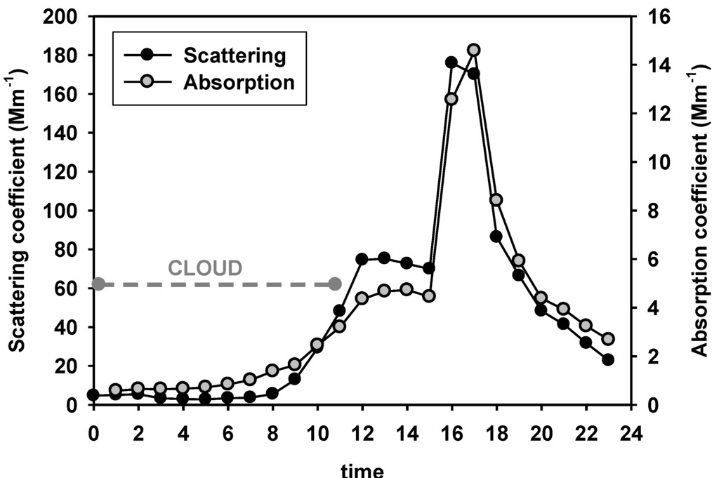 Scattering and absorption coefficients at a wavelength of 550 nm 30 July 2010. Grey horizontal bar indicates the time that the station was inside a cloud. Time is UTC + 2.