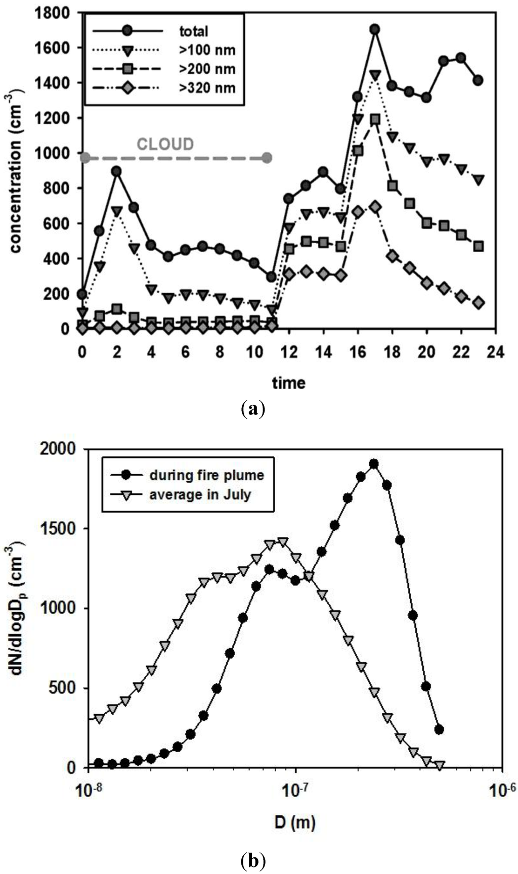 (a) Number concentration of different size particles measured with DMPS on the 30 July 2010. Grey horizontal bar indicates the time that the station was inside a cloud. (b) Aerosol number size distributions during the smoke plume and on average in July 2010.