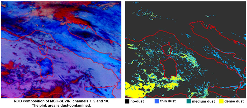 The thresholds have been determined from samples of dust-contaminated pixels carefully selected by examining a MSG-SEVIRI data set acquired during night and day time. In particular, during day time the MSG-SEVIRI pixels have been co-located with the correspondent Aerosol Robotic Network (AERONET) data and Moderate Resolution Imaging Spectroradiometer (MODIS) aerosol products (MOD04/MYD04); these ancillary data have been used to help the classification of dust-contaminated areas that are difficult to detect, especially the ones characterized by low aerosol optical depth values. MOD04/MYD04 (Collection 5.1) are daily products with spatial resolution of 10 km × 10 km containing MODIS aerosol products acquired from Terra/Aqua platforms, respectively. MODIS Deep Blue optical depths have been used in this comparison. The collocation procedure designates the product with the coarser resolution as the master (in this case MOD04/MYD04). The collocation assigns to each master pixel all the observations from the other products that fall within the spatial coverage of that master pixel. The thresholds have been determined by examining RGB composition of MSG-SEVIRI channels acquired at 8.7 µm, 10.8 µm, and 12.0 µm. In particular, Red = T12.0 − T10.8 (the range considered for this brightness temperature difference is from −4 K to +2 K, approximately), Green = T10.8 − T8.7 (approximately from 0 K to +15 K), and Blue = T10.8 (approximately from 261 K to +289 K). The RGB dust colour changes from blue/violet to red passing from high to low pressure levels during night time. During daytime, the RGB dust colour presents different gradations of pink by passing from high to low pressure levels. The same RGB composite of MSG channels has been analyzed by Banks and Brindley (2012). The dust-contaminated pixels are grouped for brightness temperature ranges, solar and satellite zenith angles as well as for land cover types, and a Look-Up Table (LUT) for thresholds has been build. The threshold values have been set as the mean values for each sample and for each test. The algorithm selects thresholds according to the satellite zenith angle, land cover, solar illumination and the image brightness temperature ranges. The MODIS land cover product (MOD12Q1) is used for the land-cover characterization of MSG-SEVIRI pixel. Firstly, the algorithm detects whether the pixel is dust-contaminated or not; when the pixel is dust-contaminated a further set of thresholds tests are applied. These tests consider the differences between the T10.8, T10.8 − T12.0, T10.8 – T8.7, R0.8, R0.6, R1.6 actual values and the respective thresholds, and based on them, the dust-contaminated pixel is classified as contaminated by: