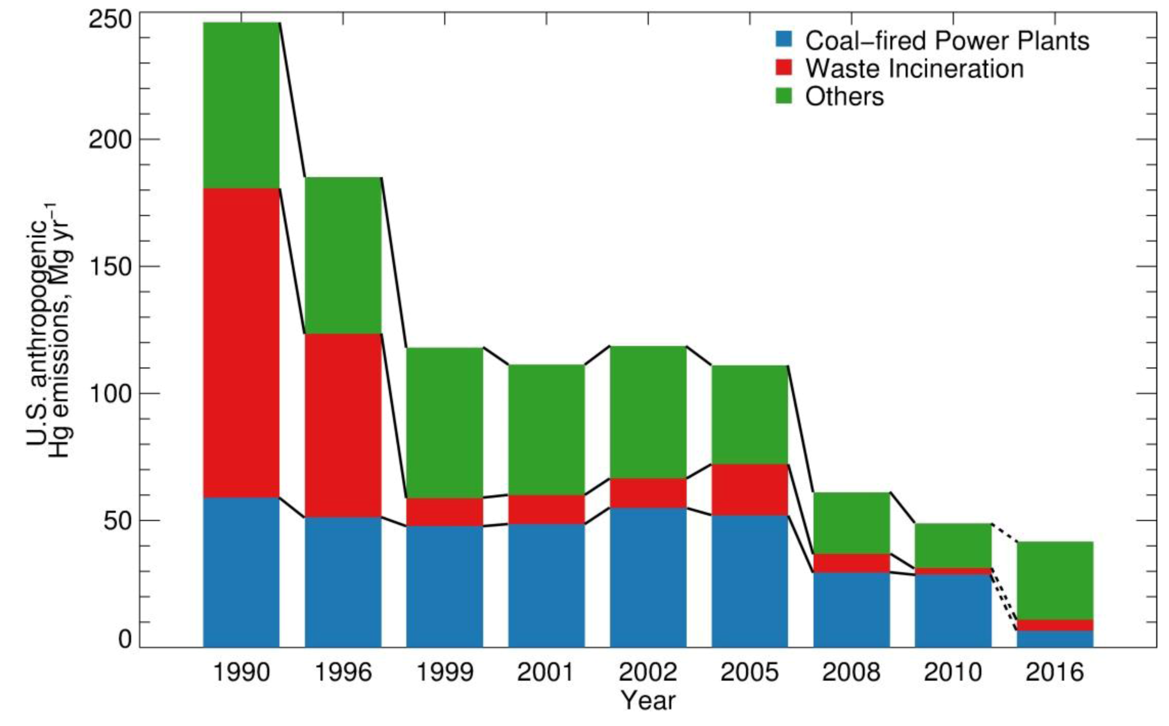 In the United States, the main anthropogenic sources of Hg include coal-fired power plants (CFPP), waste incineration, cement manufacturing, chemical production, primary metal production and metal mining [9]. The relative contribution of these domestic anthropogenic emissions to Hg deposition over the United States has been evaluated in several studies [10,11,12]. For example, Seigneur et al. [10] used a multi-scale modeling system and found North American anthropogenic emissions contributions to deposition to be 24% (wet deposition) and 43% (dry deposition). Selin and Jacob [11] found that North American anthropogenic sources contribute 27% (wet) and 17% (dry) to deposition fluxes over the US in 2004–2005. To account for the observed small fraction of Hg(II) in plumes downwind of power plants [13,14], Zhang et al. [12] modified the source profiles of Hg emitted from power plants, as well as waste incinerators and estimated lower contributions of 10% (wet) and 13% (dry) in 2008–2009.