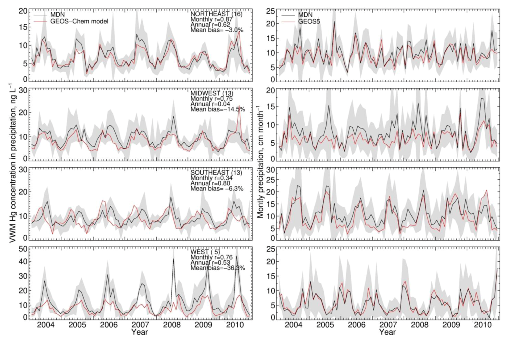 Monthly volume-weighted mean (VWM) Hg concentrations in precipitation (left) and precipitation depths (right) from Mercury Deposition Network (MDN) observations and the GEOS-Chem BASE simulation (constant anthropogenic emissions) for 2004–2010. The grey shaded area shows the ± standard deviation envelope for the MDN observations.