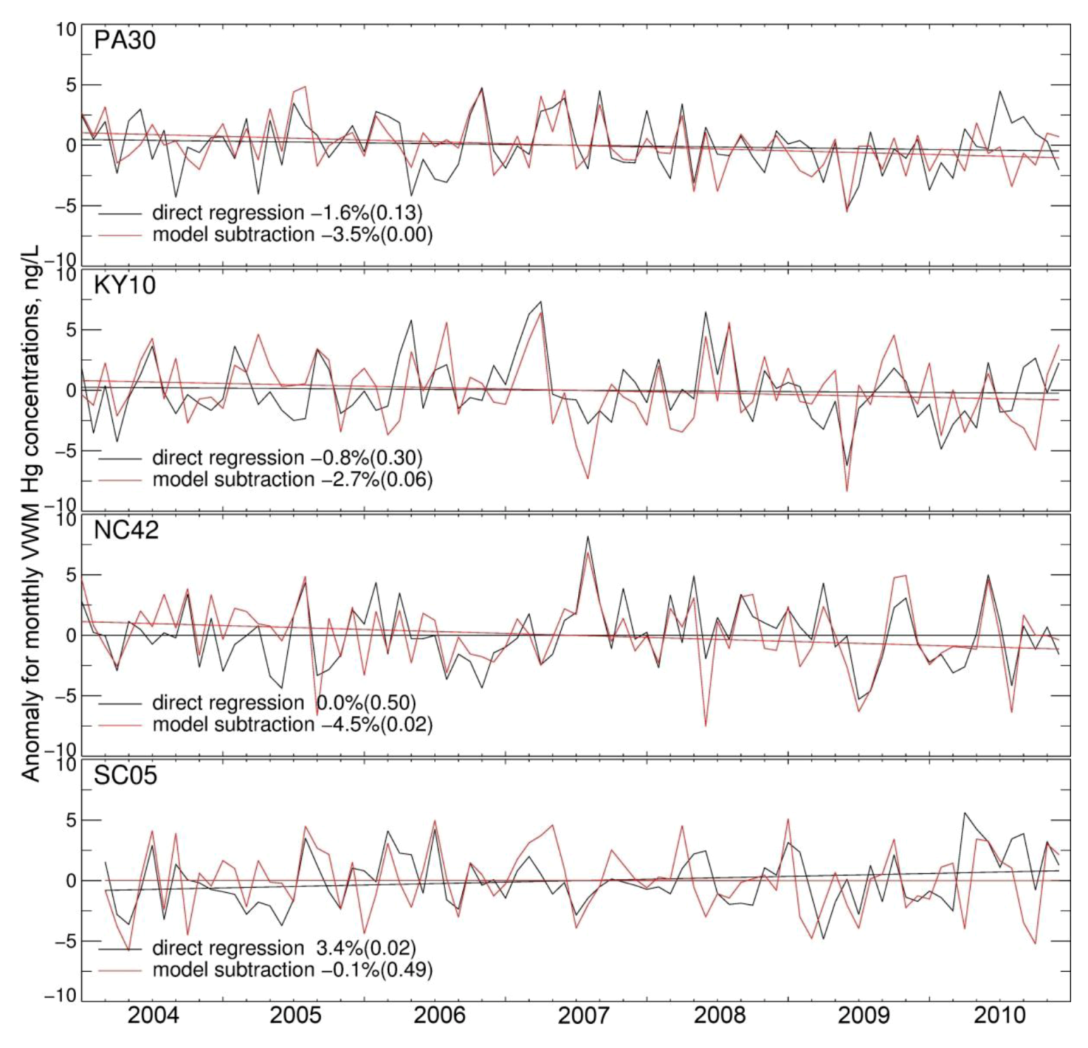Monthly deseasonalized time series of VWM Hg concentrations in precipitation for the direct regression method (black) and the model subtraction method (red). Four MDN sites are shown, from top to bottom: Erie site, Pennsylvania (PA30); Mammoth Cave National Park-Houchin Meadow, Kentucky (KY10); Pettigrew State Park, North Carolina (NC42) and Cape Romain National Wildlife Refuge, South Carolina (SC05). See Figure S1 for the location of these sites. The resulting trends, in % yr−1 and p-scores (in parenthesis) are indicated in the legend.