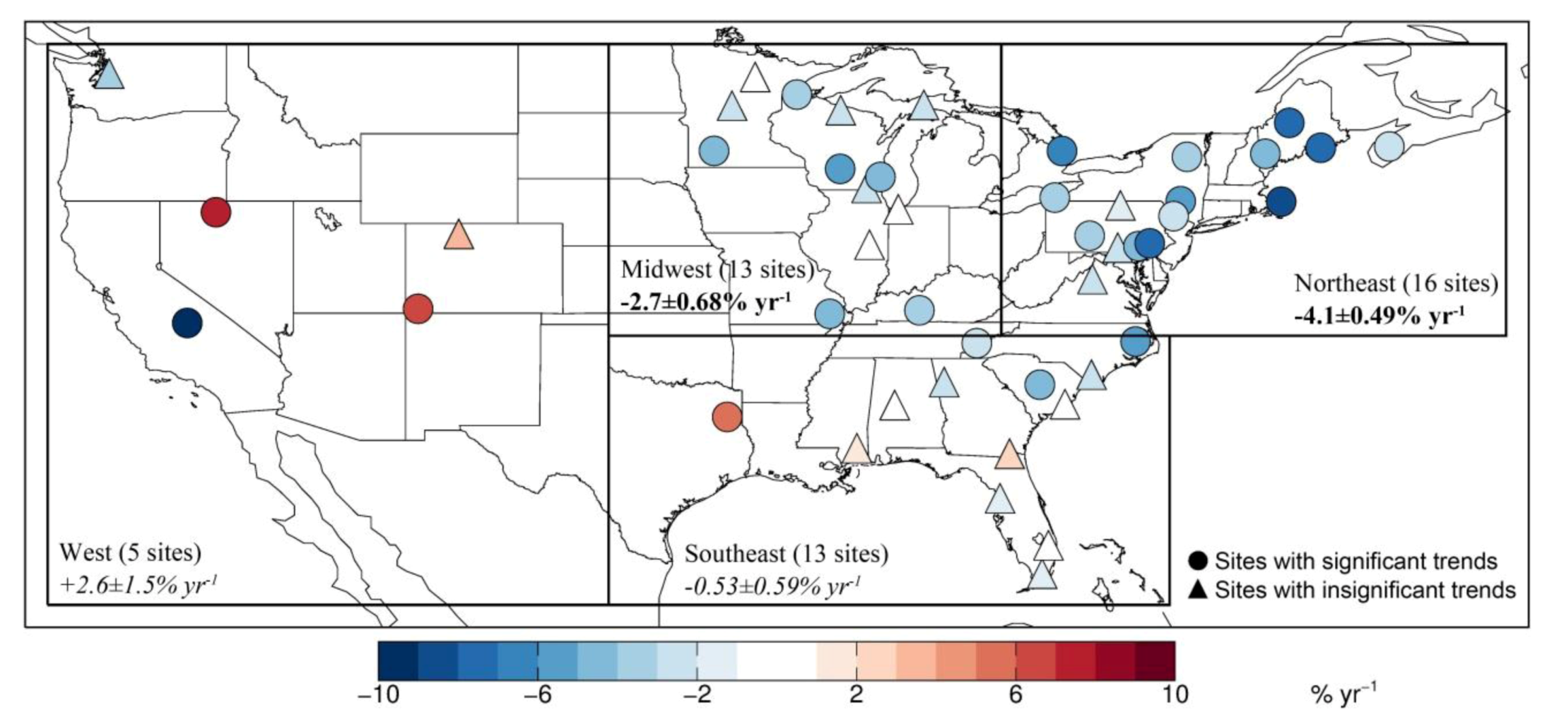 Trend in monthly VWM Hg concentrations at 47 MDN sites during 2004–2010. Sites with significant trend (p < 0.1) are shown as circles, while sites where the trend is not significant are shown as triangles. The symbols are color-coded based on the magnitude of the trend (in % yr−1). We use the results of the model subtraction method to calculate the trends (see details in Section 2). The regional trends calculated by the random coefficient model (Northeast, Midwest, Southeast and West) are also shown, with significant trends (p < 0.05) shown in bold font and insignificant ones shown in italics.
