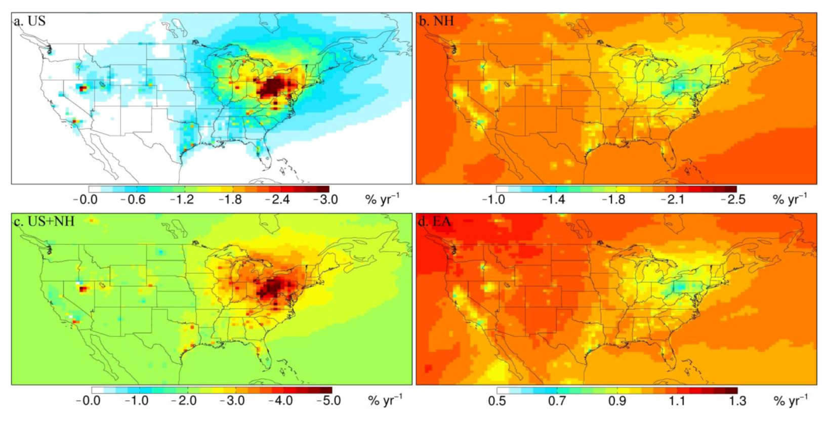 Calculated trends (% yr−1) in VWM Hg concentrations over the US for scenarios US, NH and EA, compared with the BASE simulation. (a) Trend for US scenario (45% reduction of Hg emissions from domestic sources); (b) trend for NH scenario (12% decrease of Hg background atmospheric concentrations); (c) combined US and NH scenarios; (d) trend for EA scenario (32% increase in Hg emissions from East Asia).
