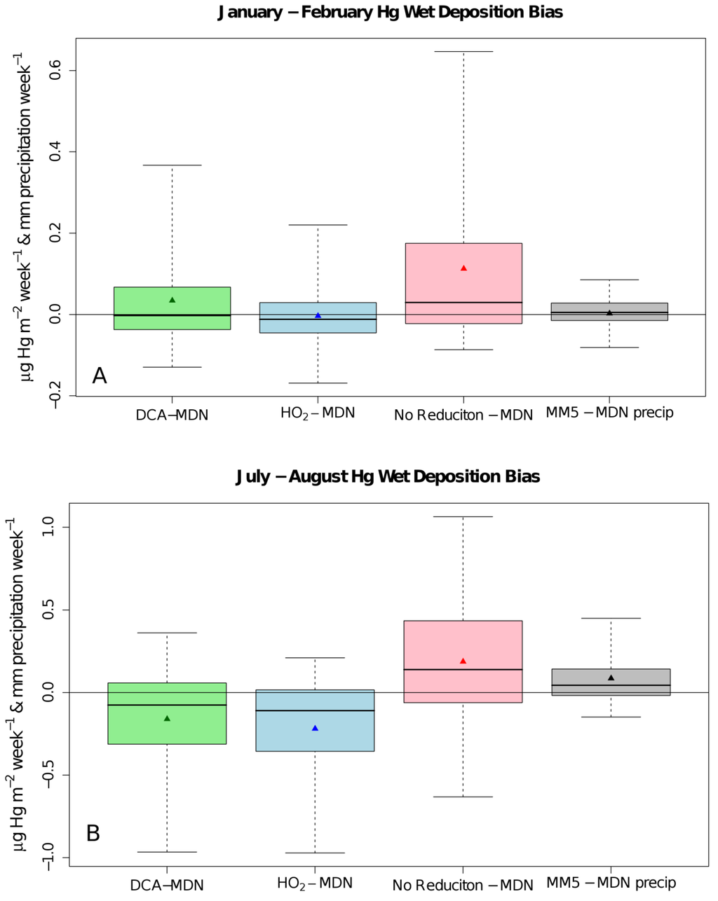 Boxplots of the Community Multiscale Air Quality (CMAQ) modeled bias in the Hg wet deposition and precipitation compared to mercury deposition network (MDN) observations using the DCA (green), HO2 (blue), and NAR (red) cases and the MM5 precipitation (grey) for January and February 2002 (A) and July and August 2002 (B). The horizontal line through each box is the median bias, the box contains the 25% to 75% and the whiskers extend to the 5th and 95th percentile of the biases, and the triangle is the mean bias.
