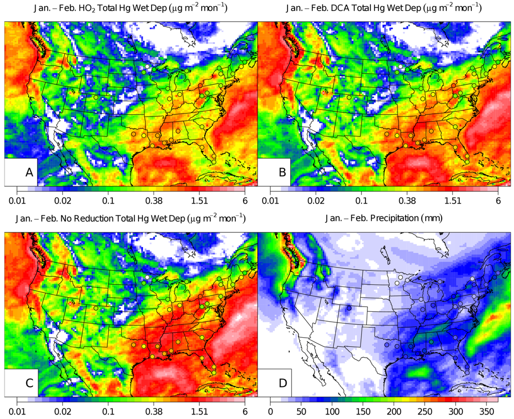 CMAQ January and February 2002 wet deposition with MDN observations (points) for the HO2 aqueous-phase reduction case (A), the DCA reduction case (B), NAR (C), and a map of the precipitation (D). Note, only the MDN measurement sites that had a complete set of observations over the two-month period were plotted.