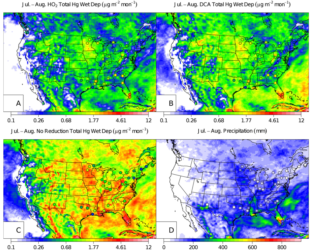 CMAQ July and August 2002 wet deposition with MDN observations (points) for the HO2 aqueous-phase reduction case (A), the DCA reduction case (B), NAR case (C), and a map of the precipitation (D). Note, only the MDN measurement sites that had a complete set of observations over the two-month period were plotted.