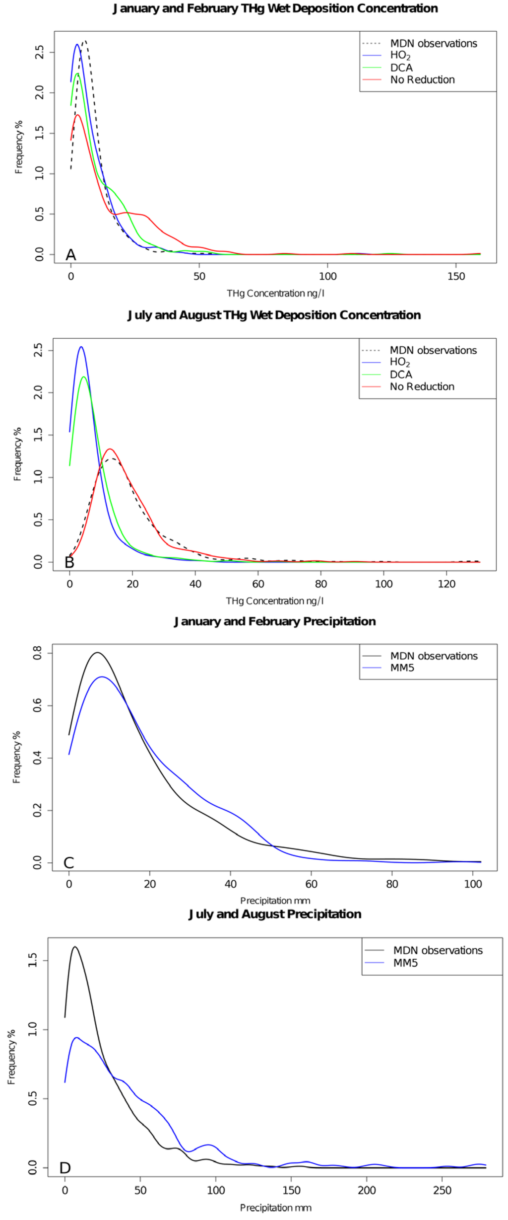 Simulated intensity, duration and quantity of precipitation influences estimated wet deposition and the concentration of Hg in precipitation. The impact of the weekly precipitation quantity and weekly mean MDN and modeled Hg concentration (μg∙m−3) in the precipitation can be explored using MDN observations. MM5 precipitation estimates were relatively unbiased in the wintertime simulation (Figure 4). In the summer simulations, the bias was reversed by over-predicting the frequency of weeks with high precipitation and under-predicting the frequency of weeks with lower precipitation. The distribution of modeled Hg concentrations did not follow precipitation distributions in the summertime simulations except for the NAR case indicating that the HO2 and DCA reduction cases may be too fast. Summer distributions of modeled concentrations were similar in the NAR case but did not correlate well (Pearman’s r = 0.113; Spearman’s rank correlation coefficient ρ = 0.060; N = 420) with the observations indicating that the distribution of concentrations over the domain was captured well but did not exhibit spatial or temporal patterns similar to the observations (Figure 4). Caution should be taken with the analysis of the probability distributions presented in Figure 4 because any given weekly sample may be an average of several events.