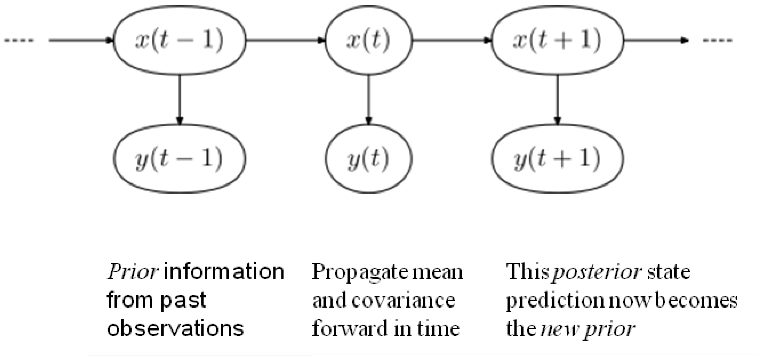 T-1 is updated with a mean and covariance from new observations (realizations) at