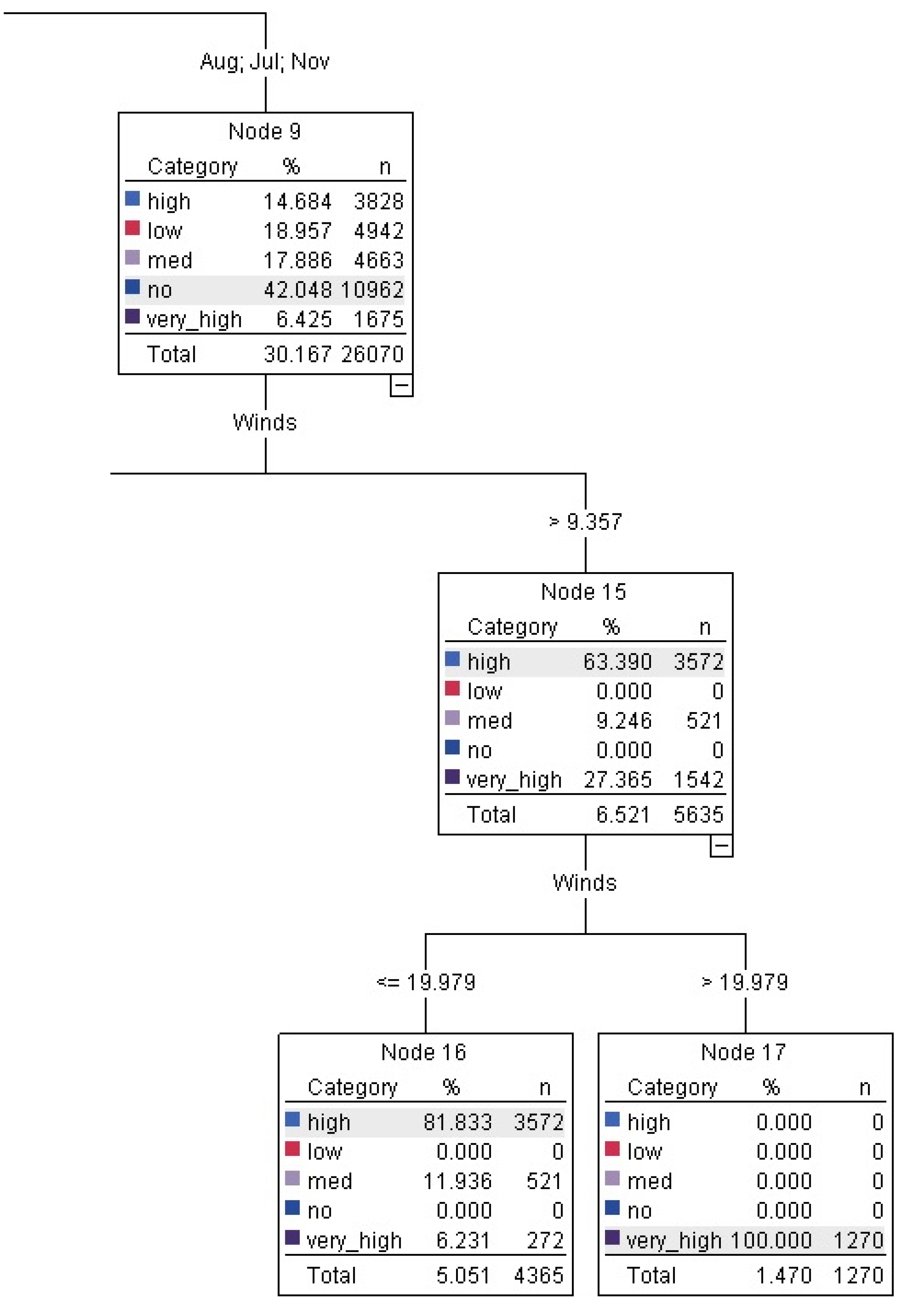 Figure 6), Rule 1 for high (1,434 instances; 0.592 confidence) and Rule 5 for very high (392 instances; 0.824 confidence) wind at speeds > 11.9 km/h in August and December months from north (≤ 0°) caused