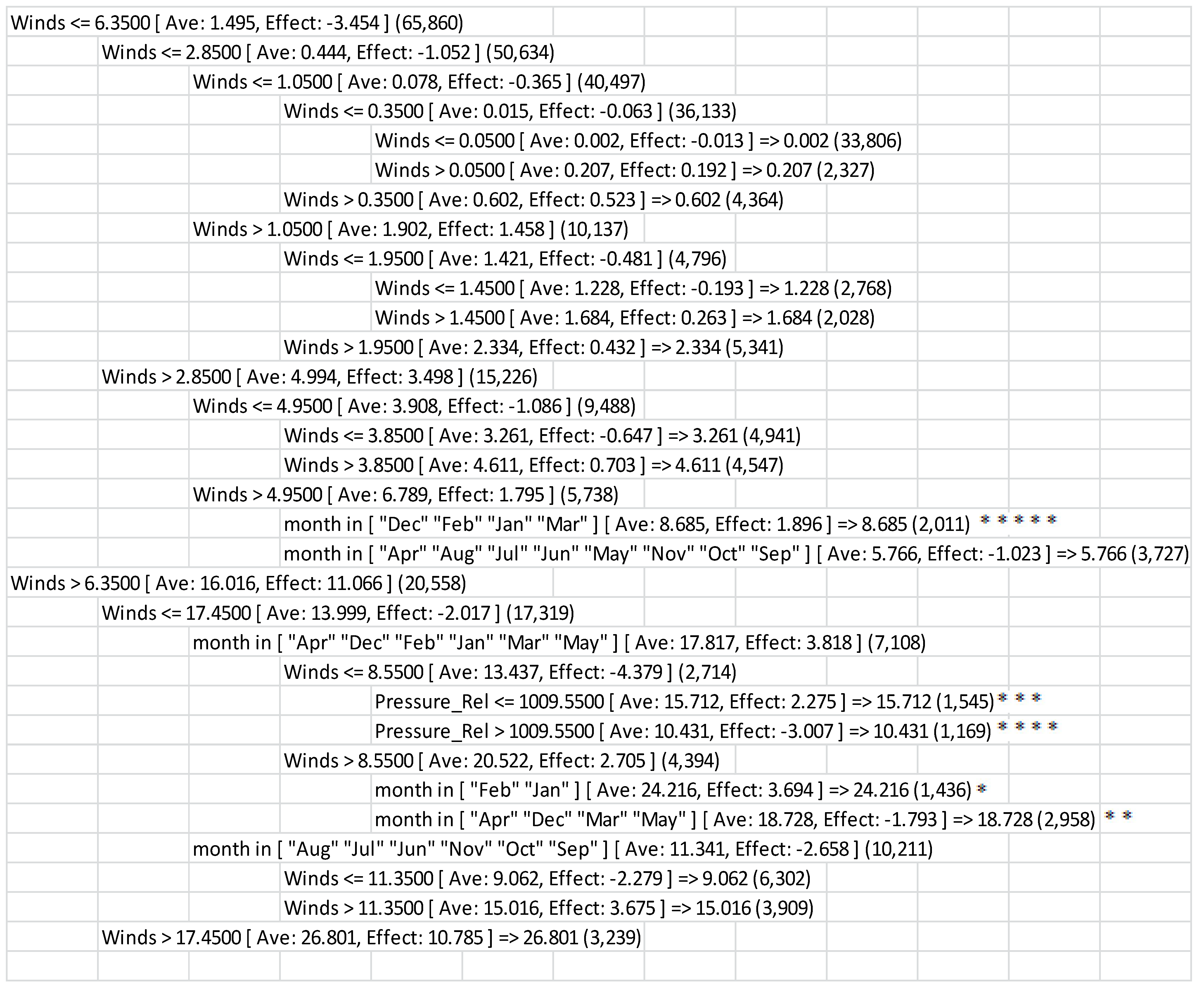 Figure 5 tree rules), high wind speed from the north has led to the highest gust range 26.237 km/h with 1,383 instances and effect 5.158. Based on CHAID real gust value rules (