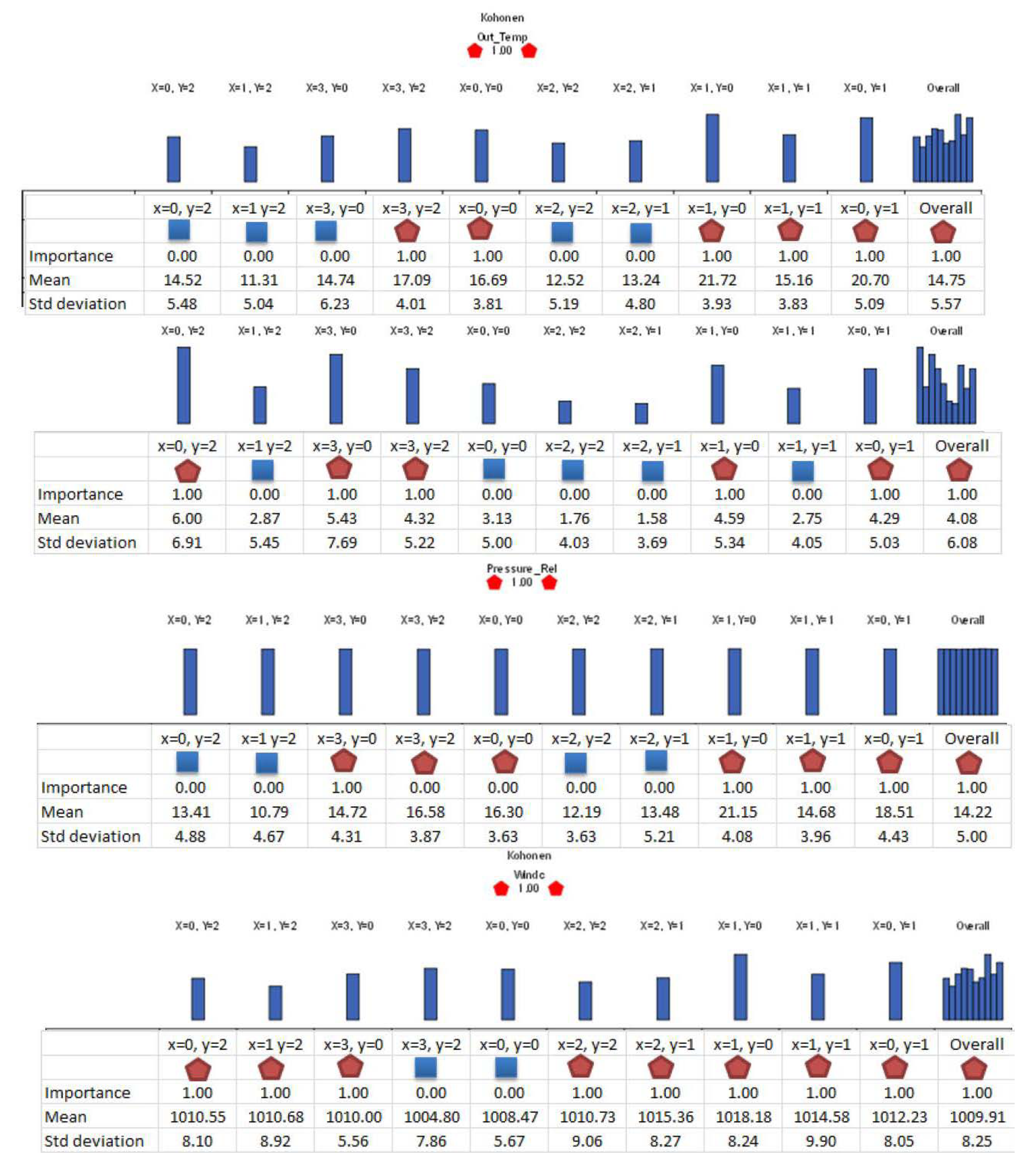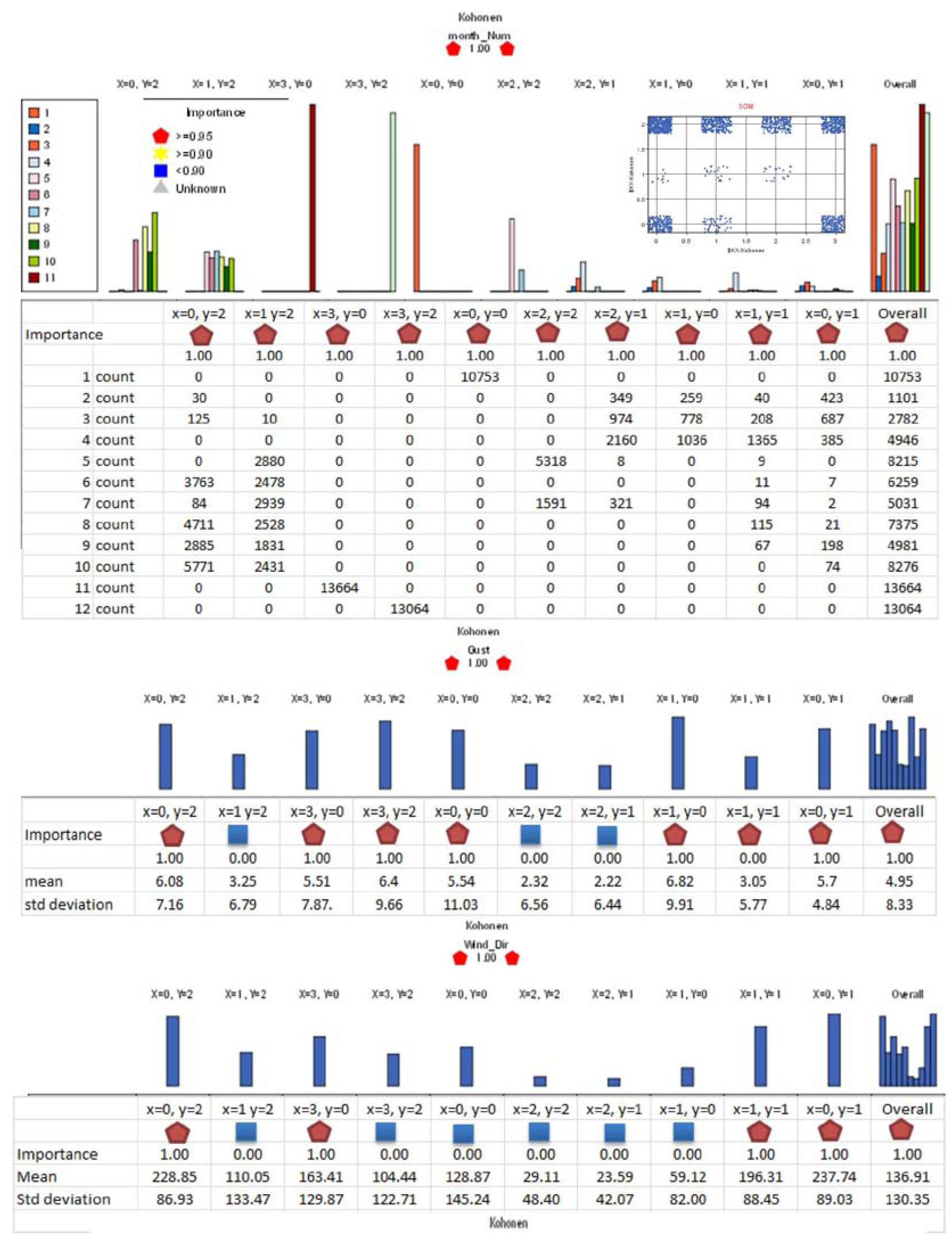 In the SOM clustering, the contribution made by different input variables to the SOM clustering of the data is indicated with a factor called “importance”. In the SOM cluster profiles, the “importance” of each input in the respective individual cluster as well as that of overall SOM is shown and it enhances the analysts’ ability to visually analyze the clustering especially the role of each input variable in that particular input and overall SOM clustering. This is similar to a “coefficient”/“correlation” and thus can be used for measuring and explaining the wind gust dependencies seen in different data mining algorithms and the regression test. As stated by visualizing the data distribution in terms of month and other SOM components (the histograms/mean and std dev. or standard deviation in profiles) one can explain as to why different data mining algorithms show different coefficients for different variables. For example, SOM cluster node (x = 0 y = 1) consisting of high gusts observed throughout the year and with gust mean 5.7 km/h and std dev. 8.49 has all variables as important, whereas for the node (x = 0 y = 0) with gust mean 5.54 km/h and std dev. 11.03 km/h January alone data, temperature and wind chill (derived from temperature) are the important contributors. Node (x = 3 y = 2) December alone cluster, as well has the same but in addition wind speed included. Node (x = 1 y = 0) consisting of February, March and April high gusts with gust mean 6.82 km/h and std dev. 9.91 km/h has all variables as important except for wind direction. Finally, pressure is found to be important for all clusters except for January and December only clusters.