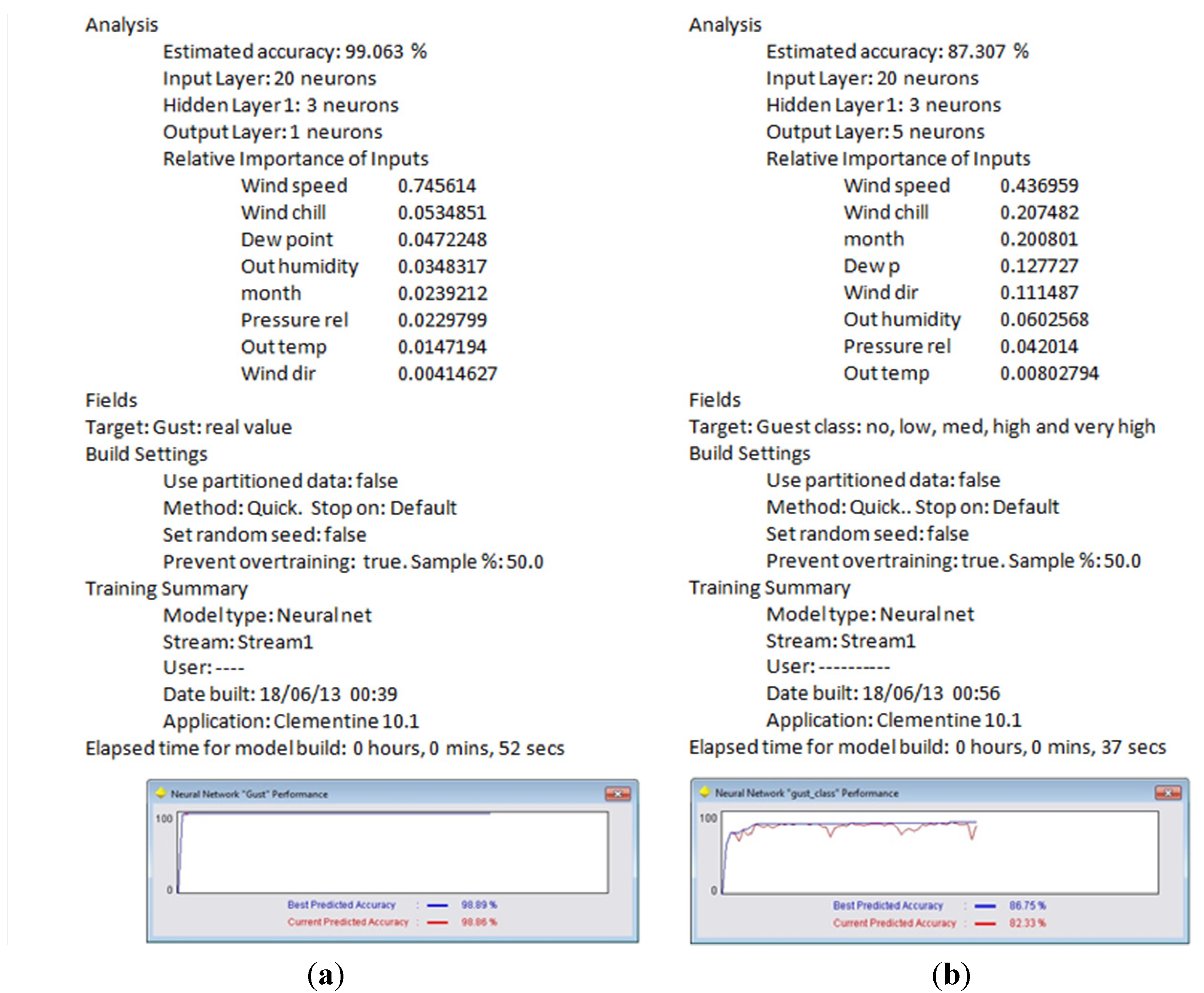 (a) Artificial Neural Network (ANN) predictions for real gust (over 99% accuracy) and (b) for gust classes (over 85% accuracy). Based on the results, more accurate real gust predictions depend on wind speed 74% and for gust class predictions, it is around 44%.